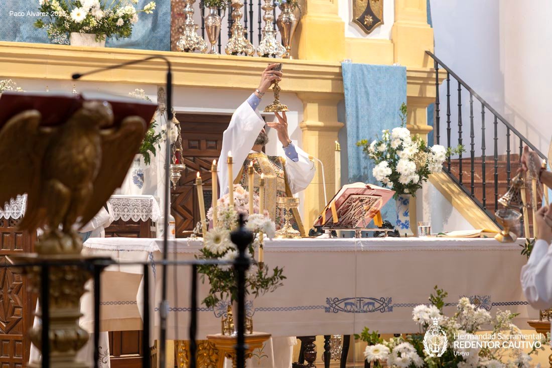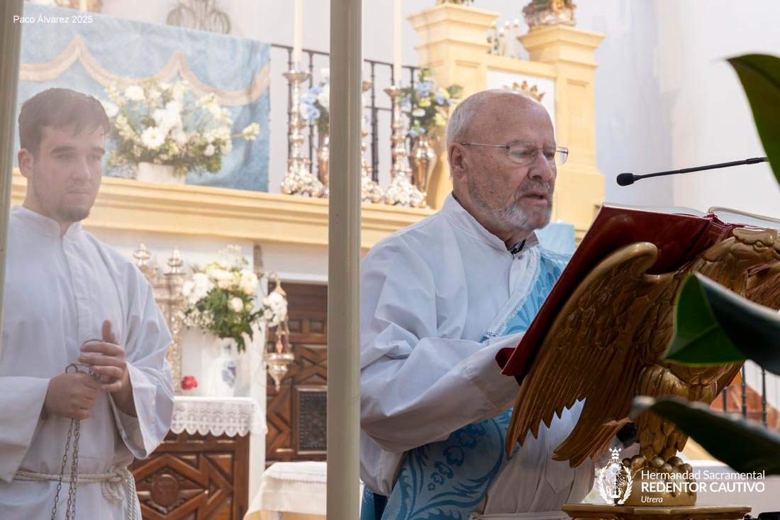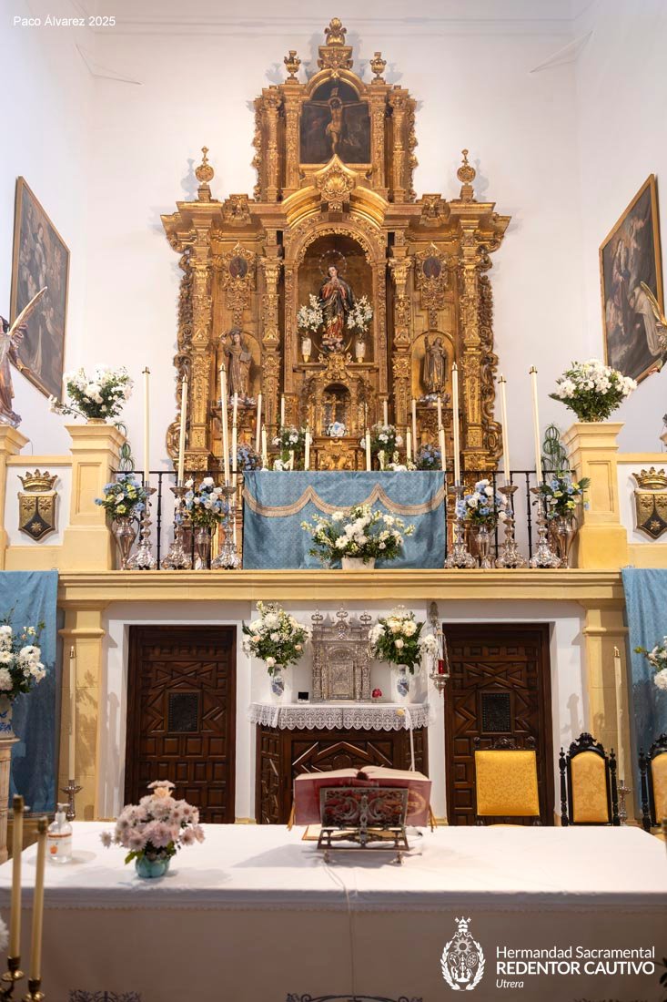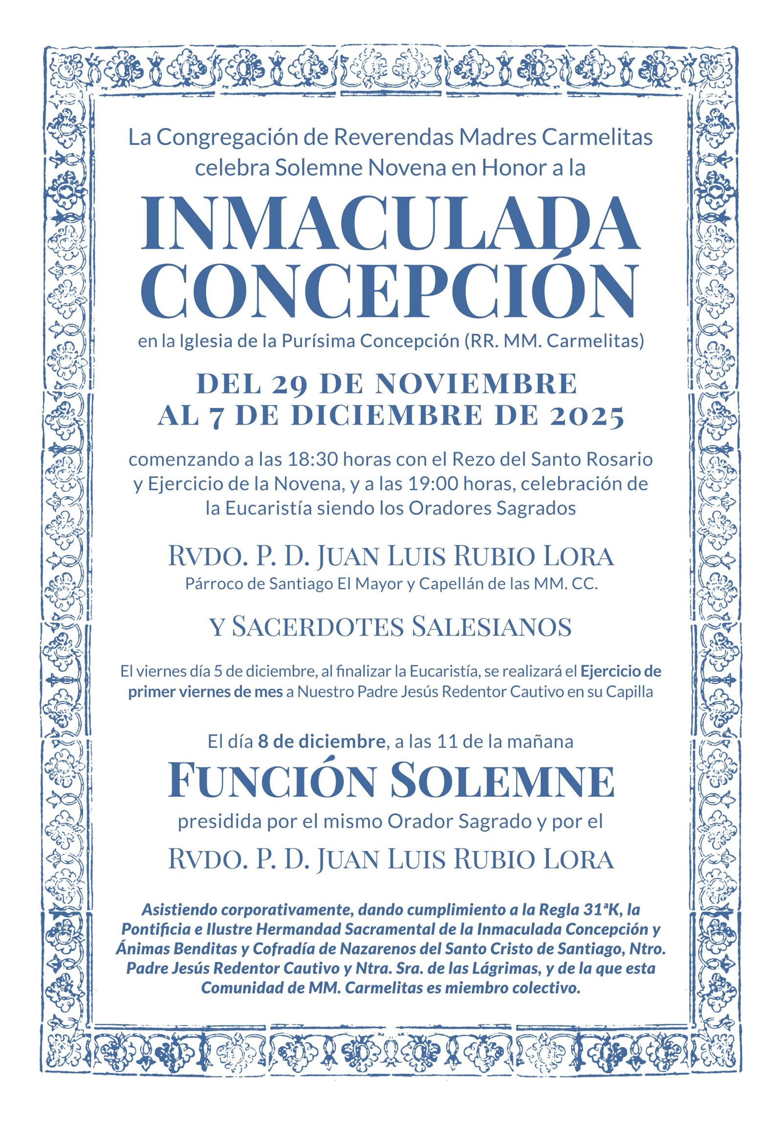 Celebrada el pasado día 8 de diciembre, a las 10 de la mañana y el RVDO. P. D. JUAN LUIS RUBIO LORA Párroco de Santiago El Mayor y Capellán de las MM. CC. Asistiendo corporativamente, dando cumplimiento a la Regla 31ºK, la Pontificia e Ilustre Hermandad Sacramental de la Inmaculada Concepción y Ánimas Benditas y Cofradía de Nazarenos del Santo Cristo de Santiago, Ntro. Padre Jesús Redentor Cautivo y Ntra. Sra. de las Lágrimas, y de la que esta Comunidad de MM. Carmelitas es miembro colectivo.