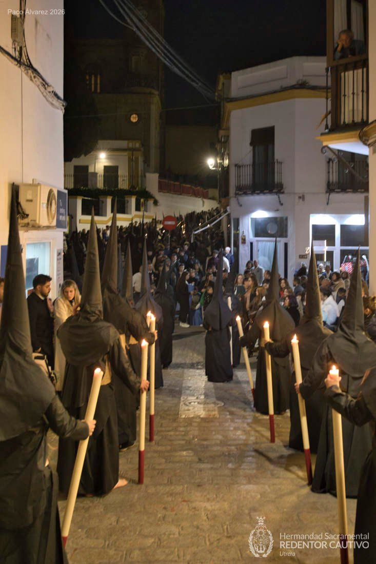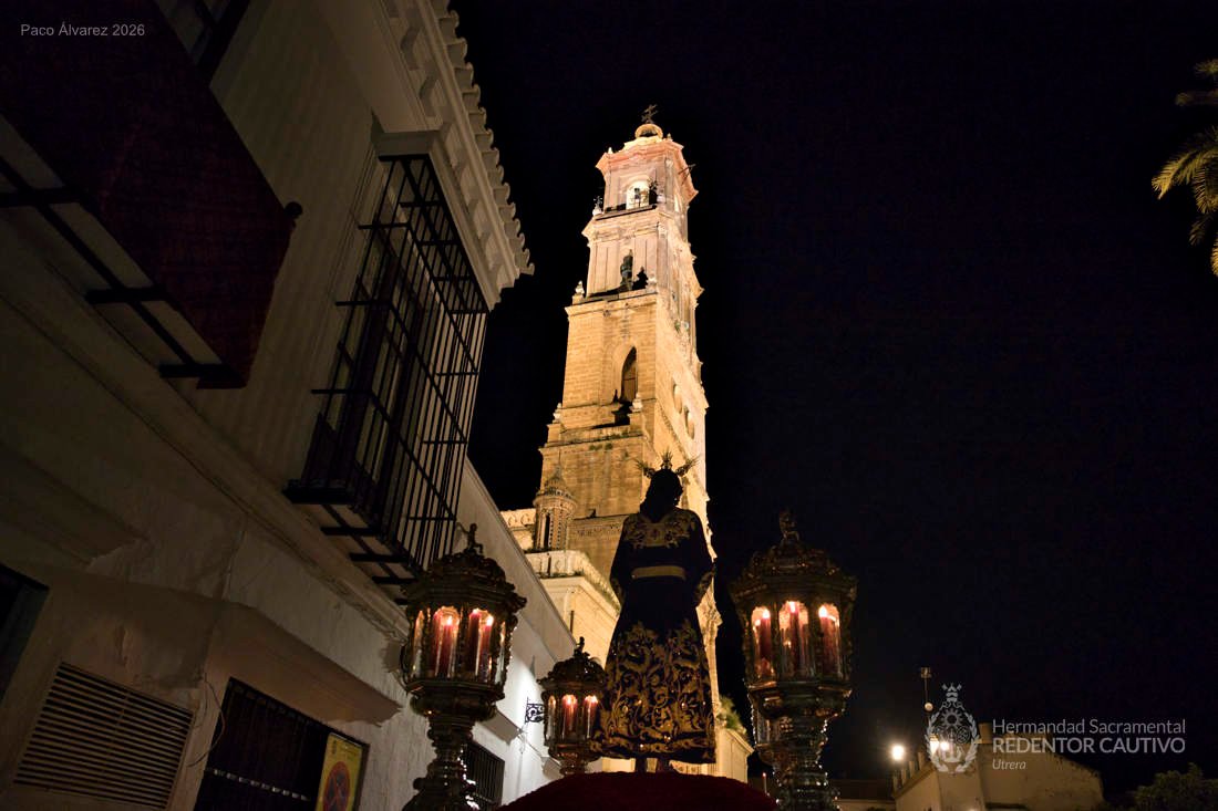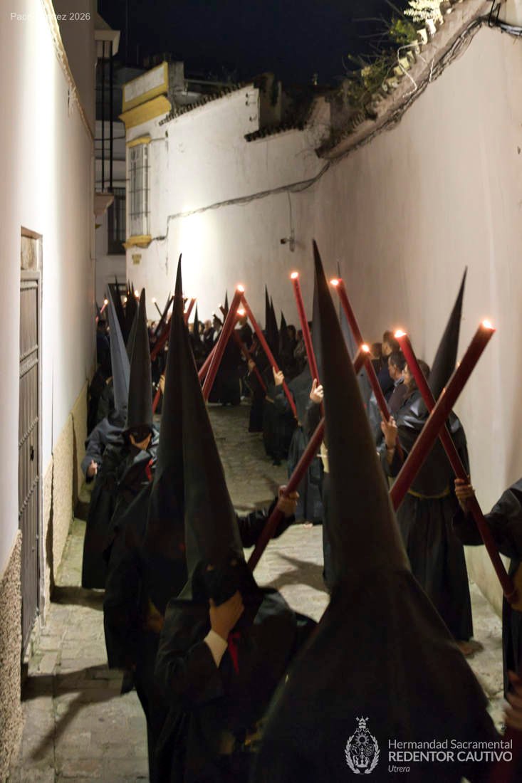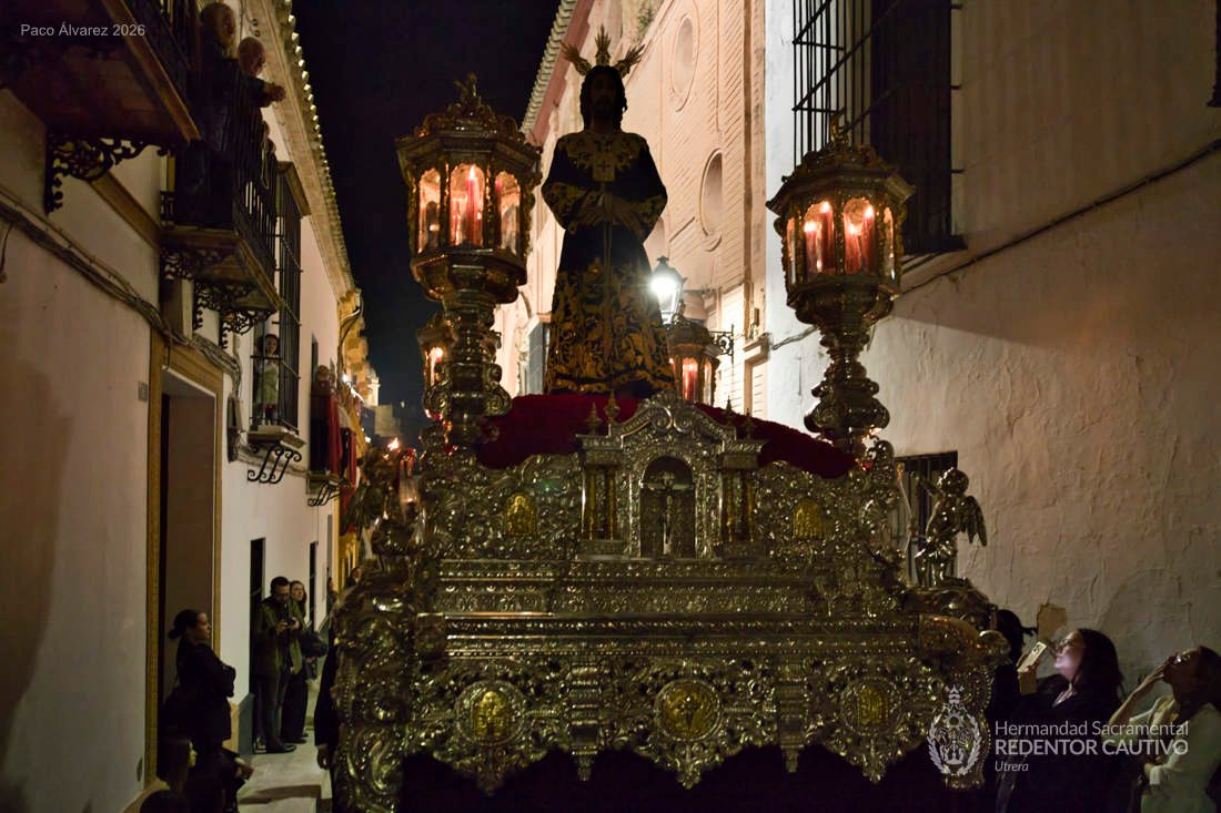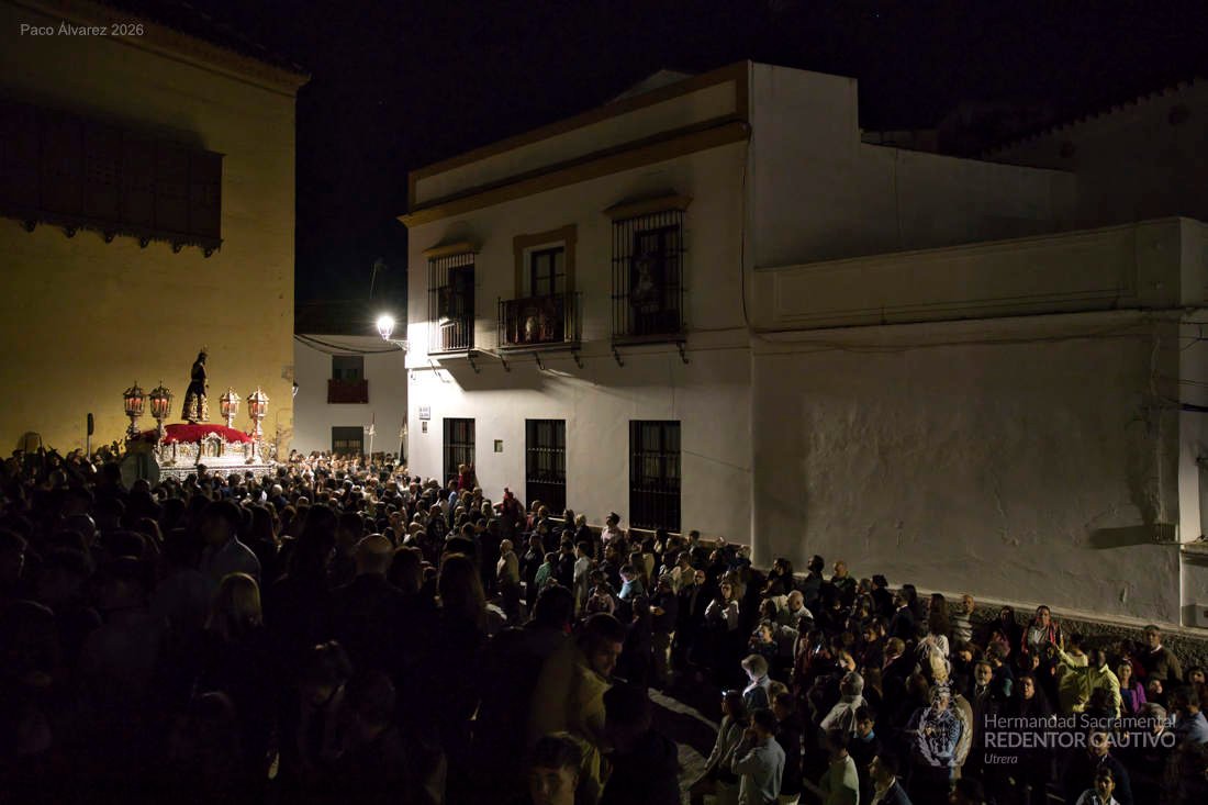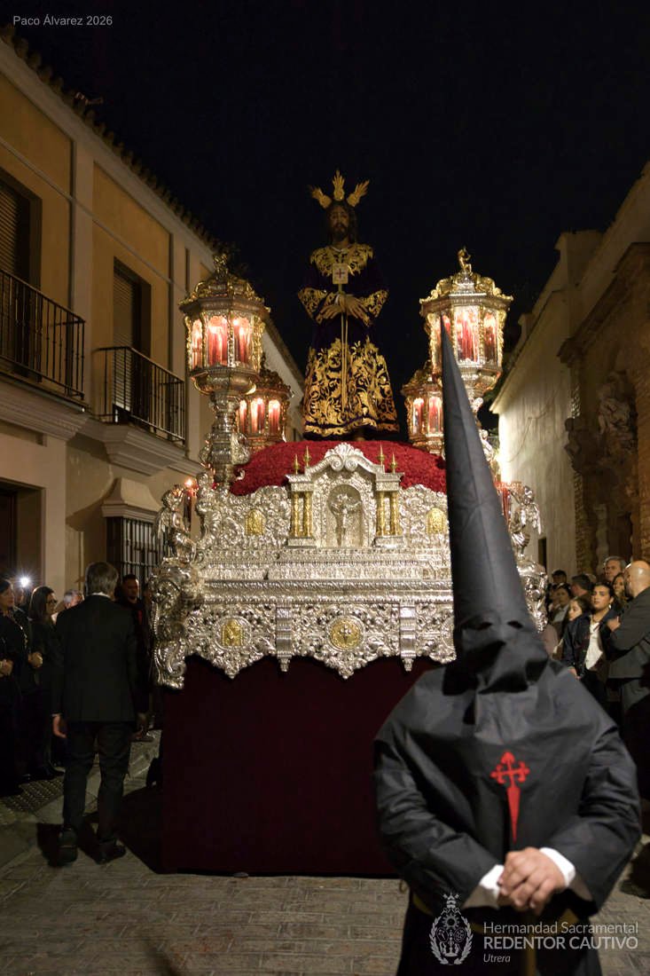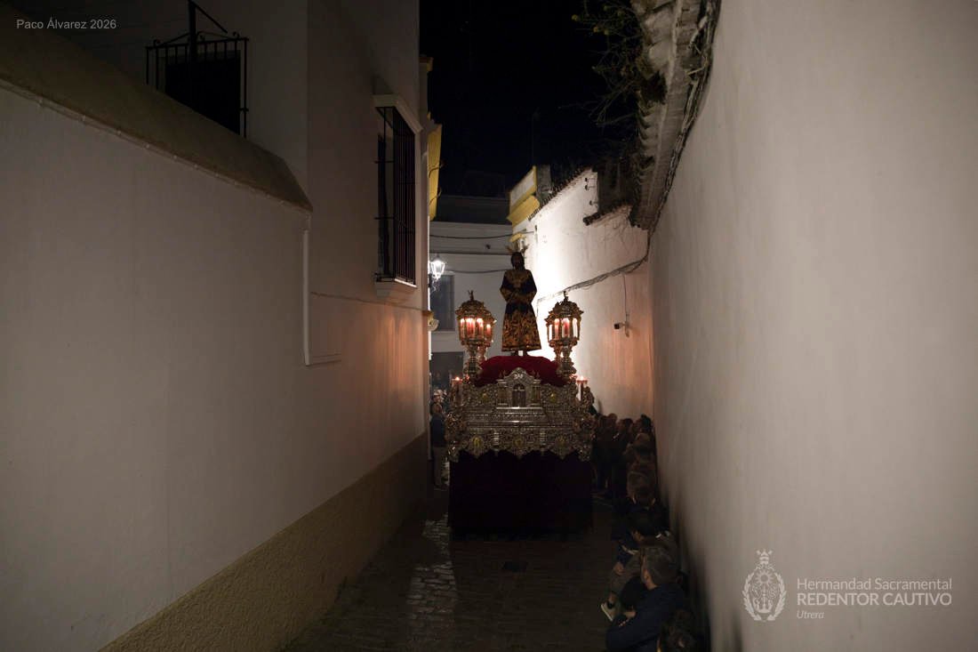 Jesús, Ntro. Padre Jesús Redentor Cautivo, avanza por las calles de Utrera. El mundo, indiferente, apenas detiene su mirada. Él camina en silencio por los senderos de la ingratitud y la injusticia; en sus manos no existe culpa alguna, salvo la del amor sin medida; sus pies desnudos pisan la gélida indiferencia del corazón humano, y su rostro, sereno en medio del dolor, refleja la obediencia perfecta y la redención del género humano.