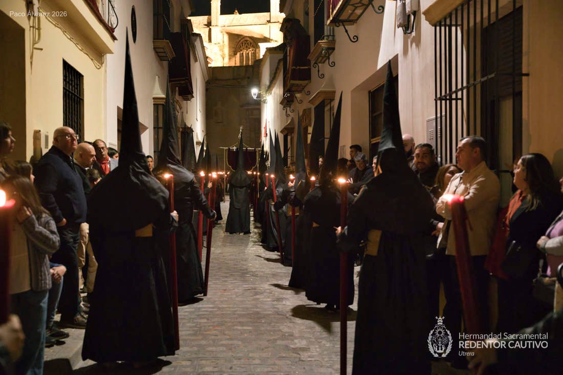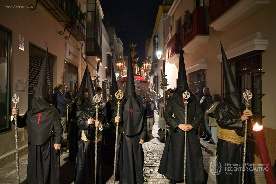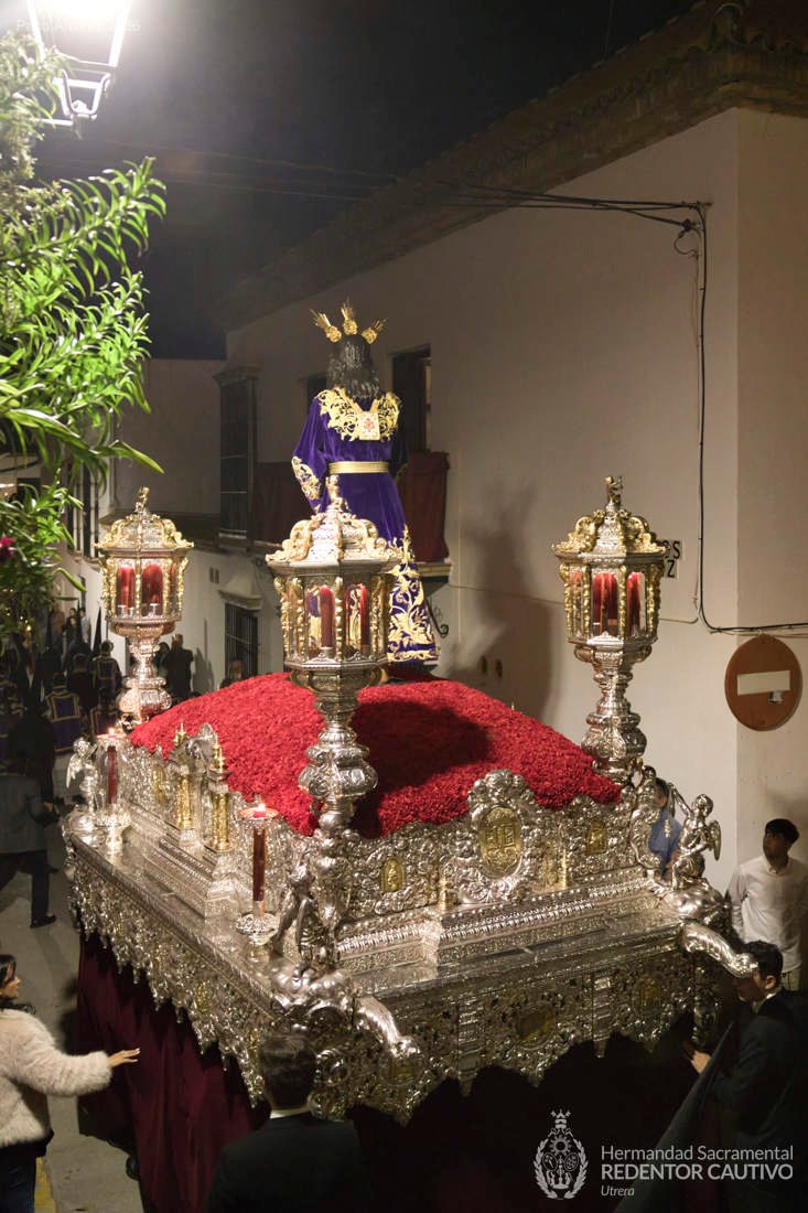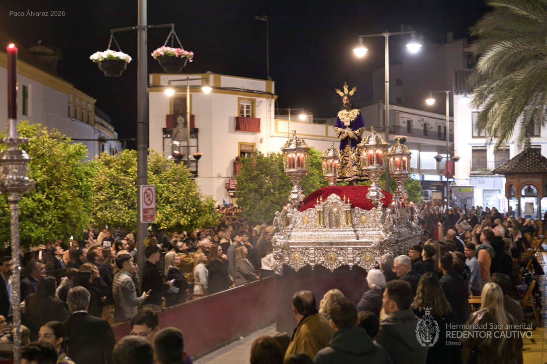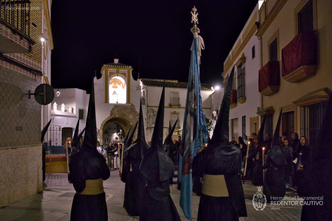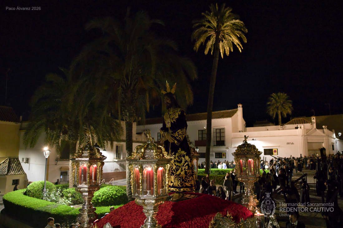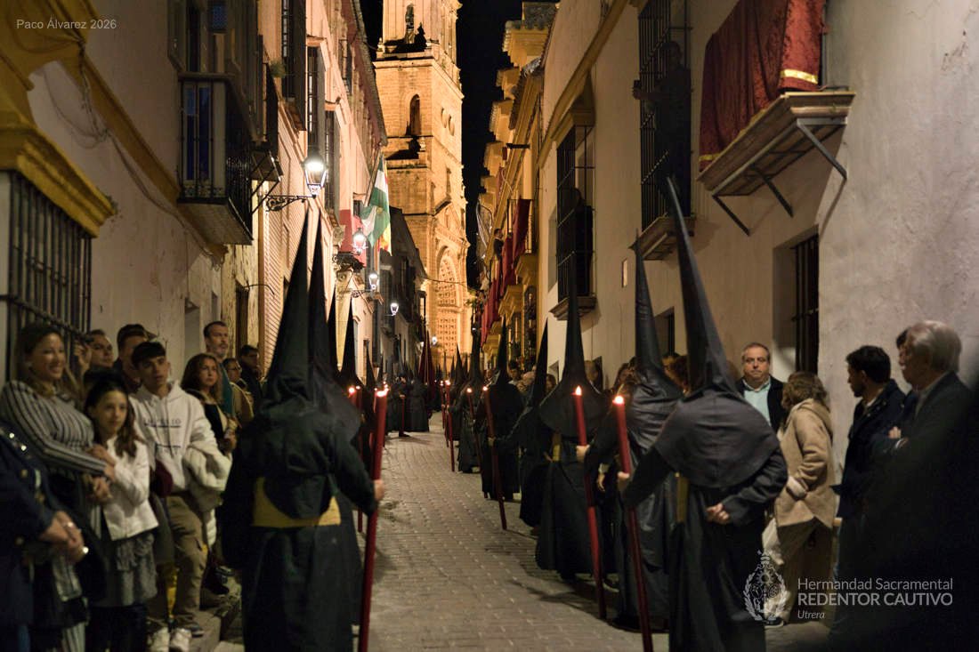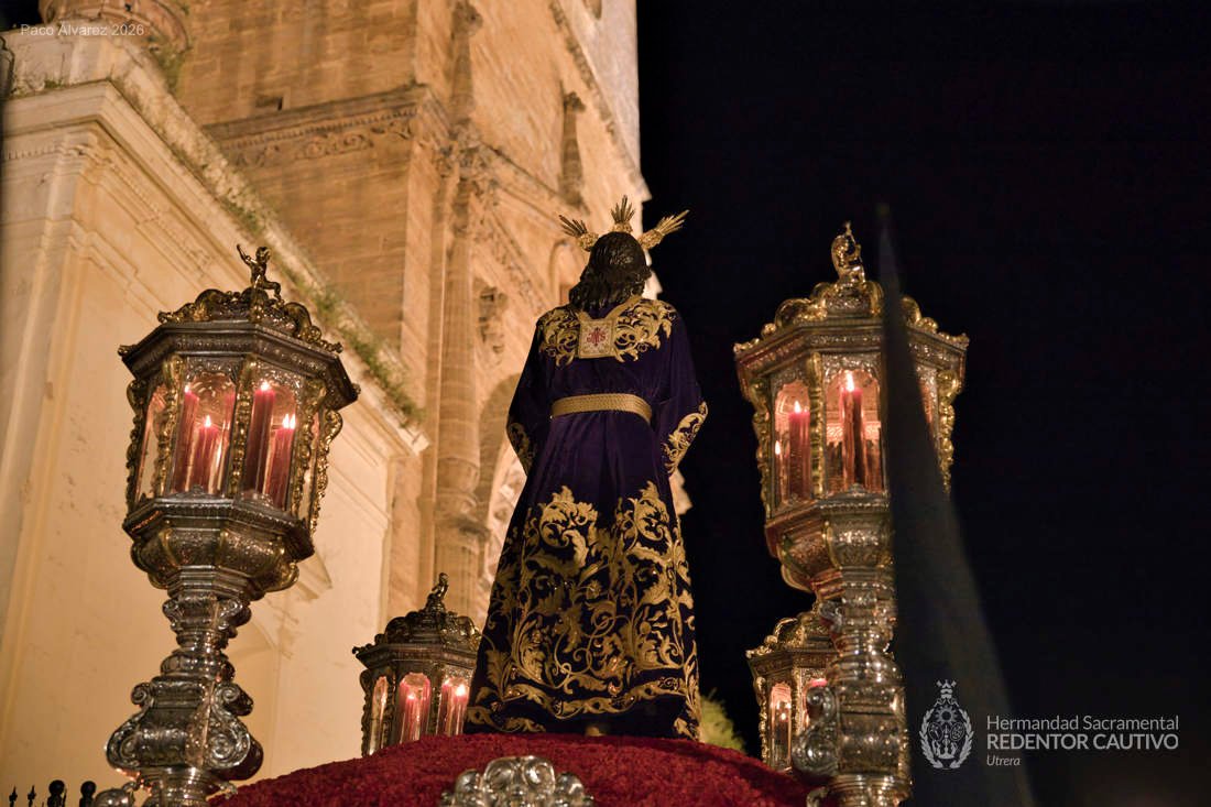 Jesús, Ntro. Padre Jesús Redentor Cautivo, avanza por las calles de Utrera. El mundo, indiferente, apenas detiene su mirada. Él camina en silencio por los senderos de la ingratitud y la injusticia; en sus manos no existe culpa alguna, salvo la del amor sin medida; sus pies desnudos pisan la gélida indiferencia del corazón humano, y su rostro, sereno en medio del dolor, refleja la obediencia perfecta y la redención del género humano.