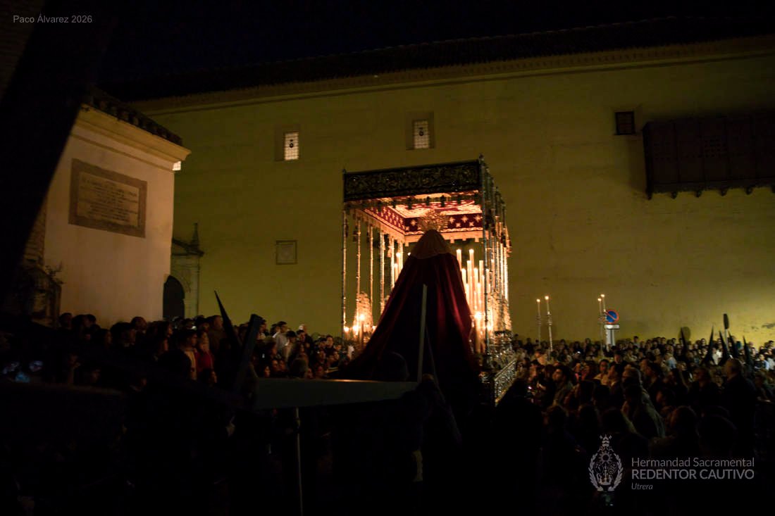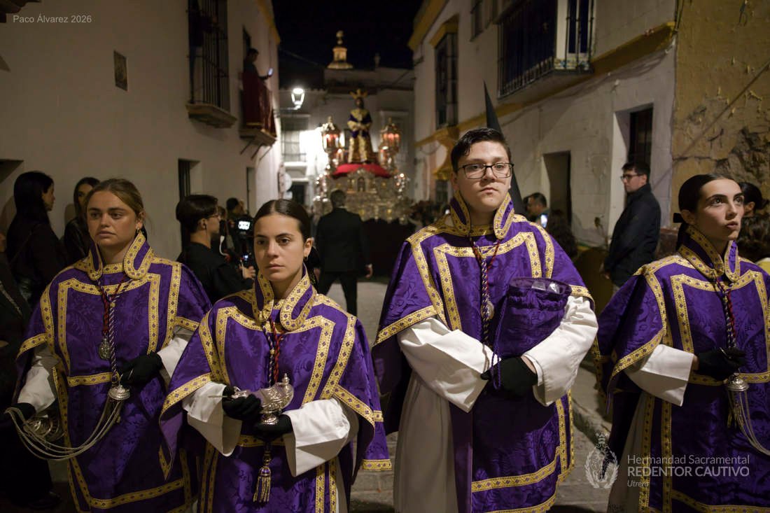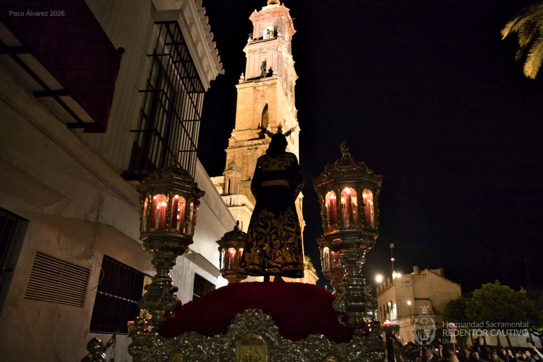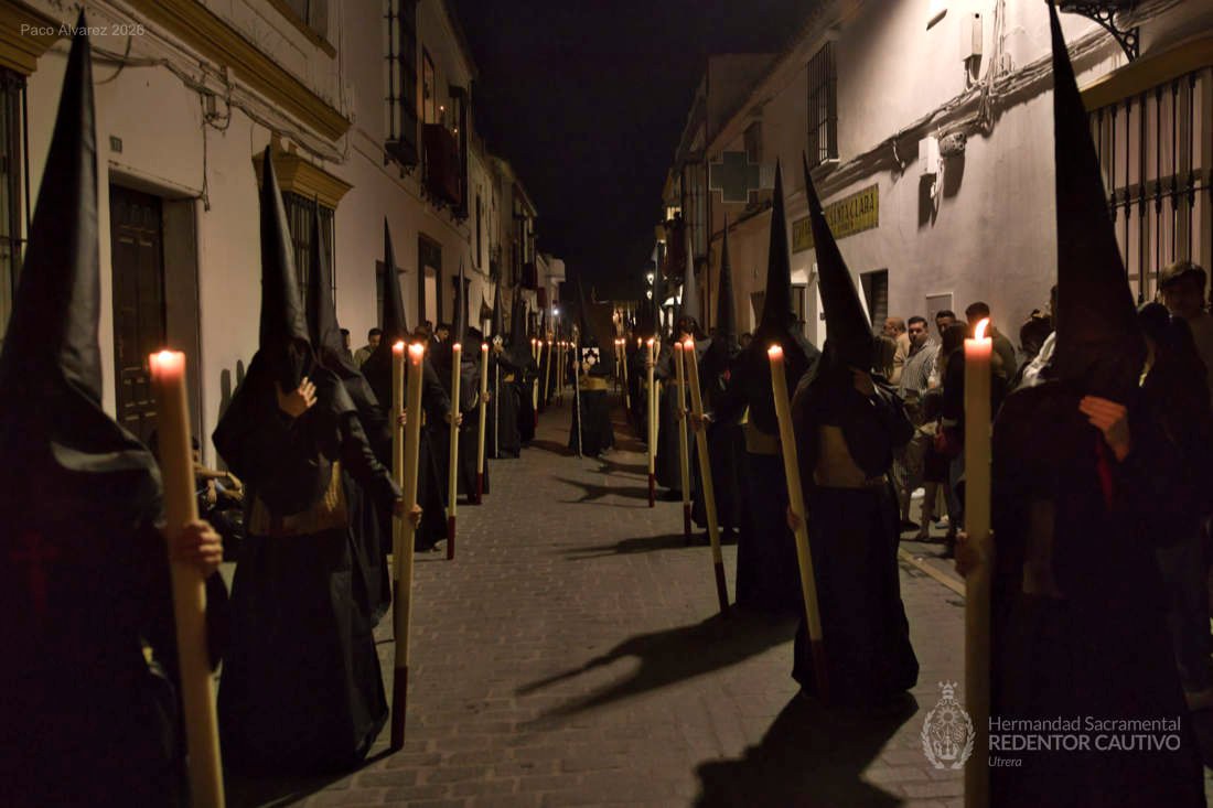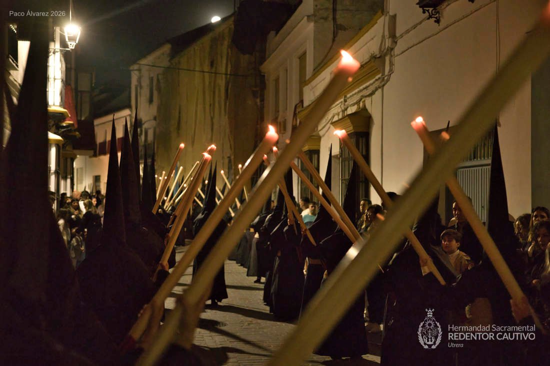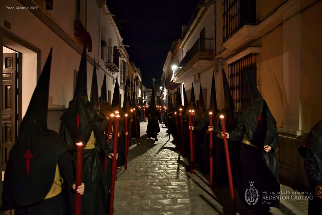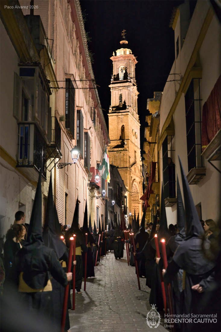 Jesús, Ntro. Padre Jesús Redentor Cautivo, avanza por las calles de Utrera. El mundo, indiferente, apenas detiene su mirada. Él camina en silencio por los senderos de la ingratitud y la injusticia; en sus manos no existe culpa alguna, salvo la del amor sin medida; sus pies desnudos pisan la gélida indiferencia del corazón humano, y su rostro, sereno en medio del dolor, refleja la obediencia perfecta y la redención del género humano.