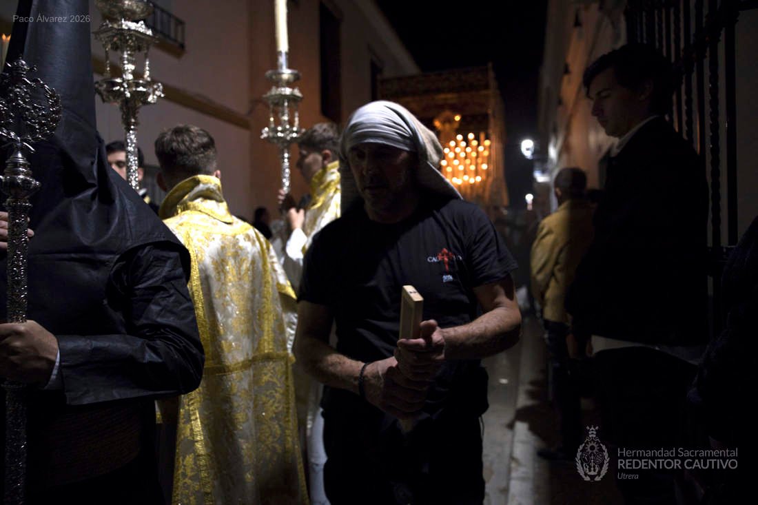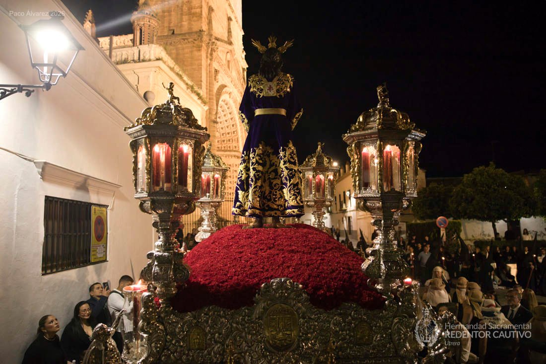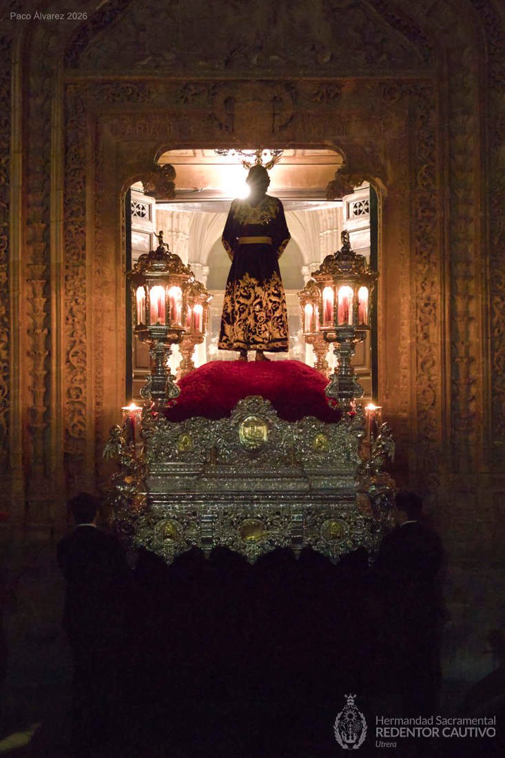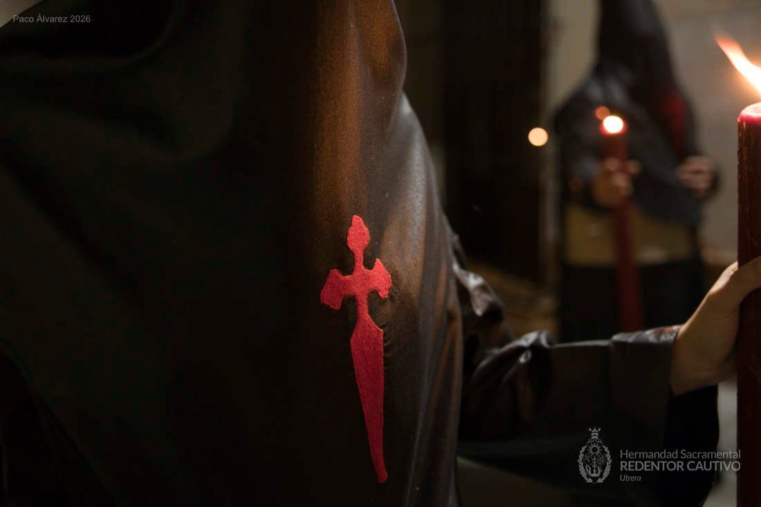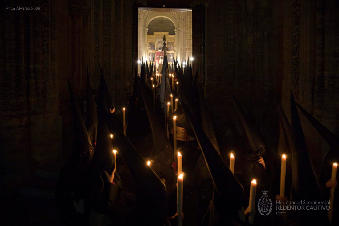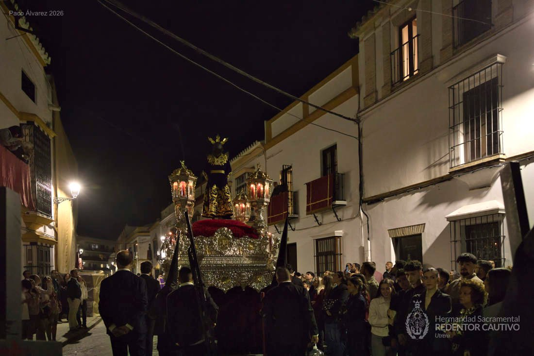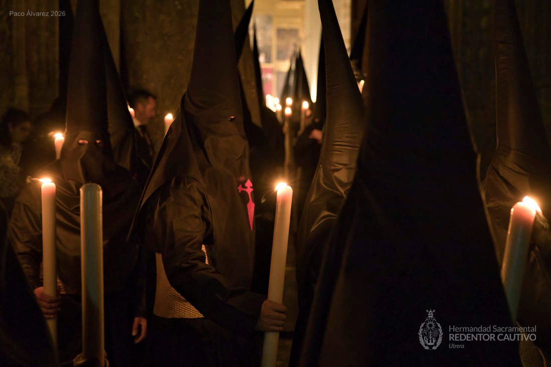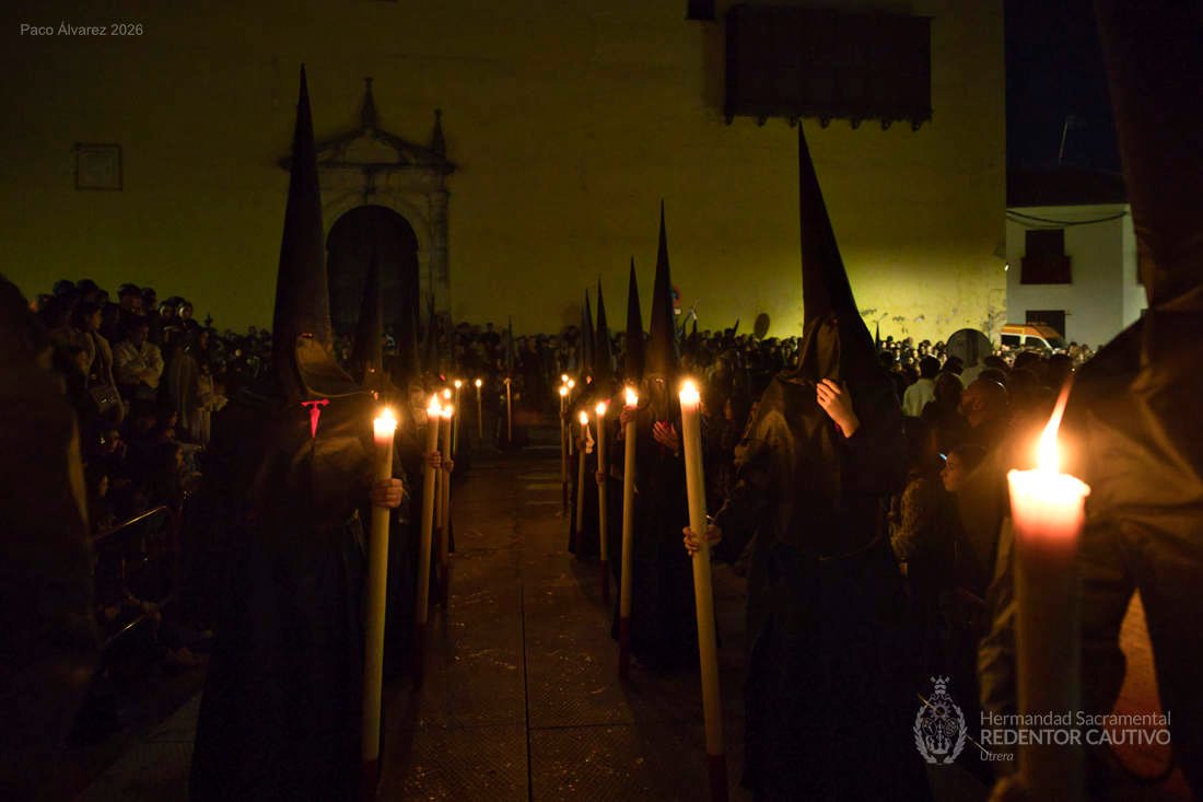 Jesús, Ntro. Padre Jesús Redentor Cautivo, avanza por las calles de Utrera. El mundo, indiferente, apenas detiene su mirada. Él camina en silencio por los senderos de la ingratitud y la injusticia; en sus manos no existe culpa alguna, salvo la del amor sin medida; sus pies desnudos pisan la gélida indiferencia del corazón humano, y su rostro, sereno en medio del dolor, refleja la obediencia perfecta y la redención del género humano.