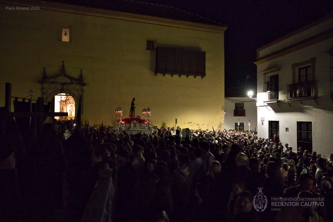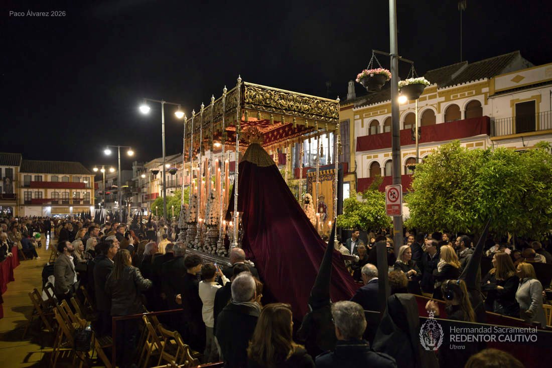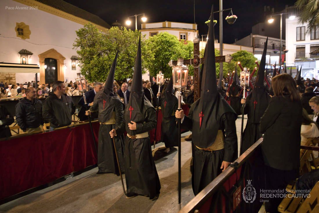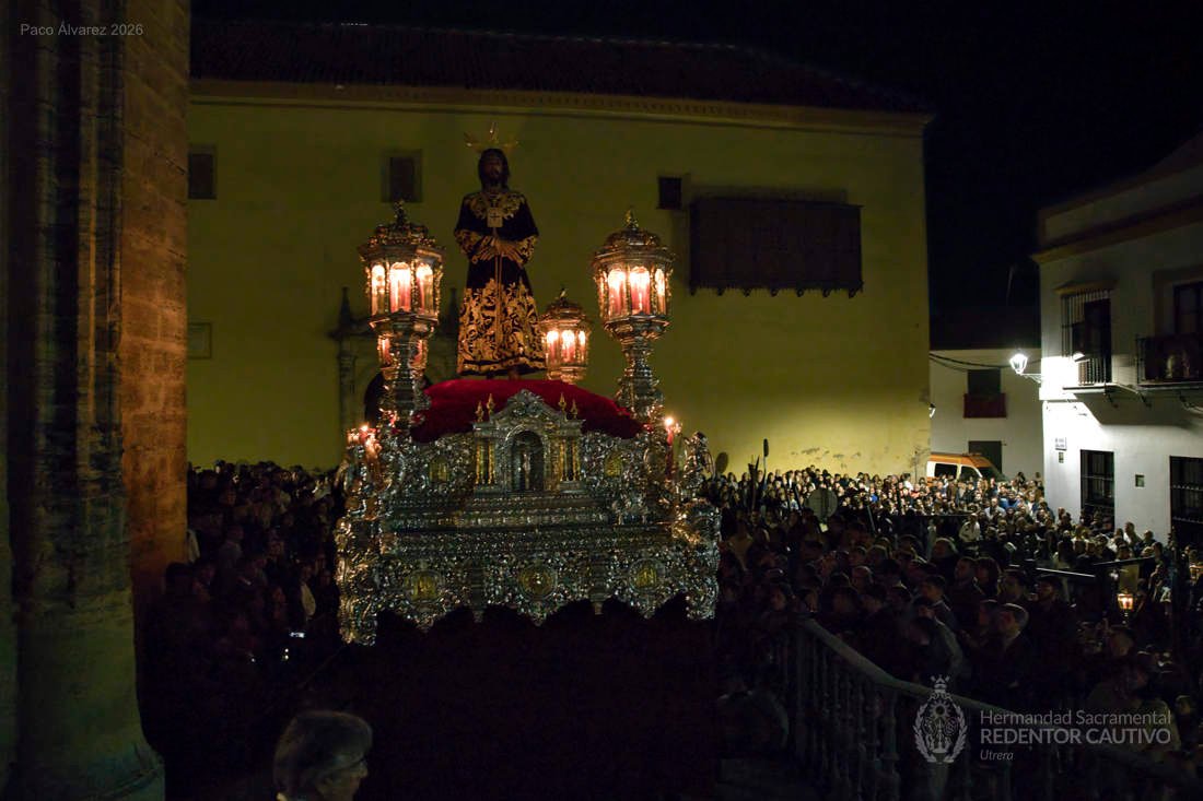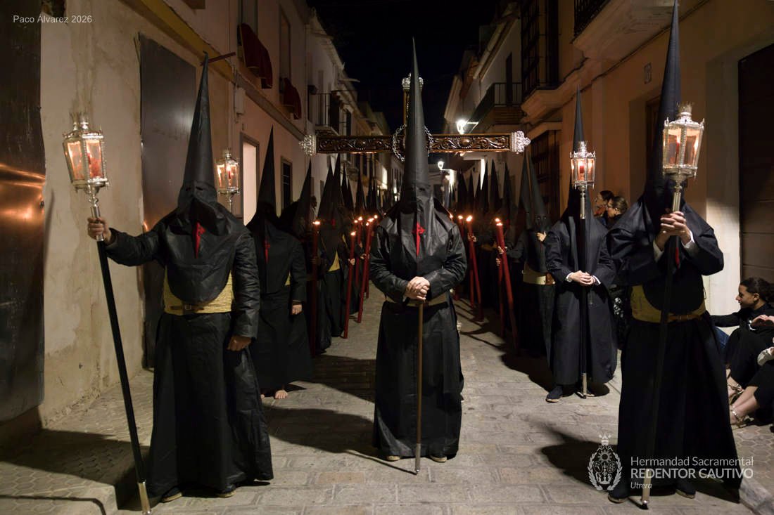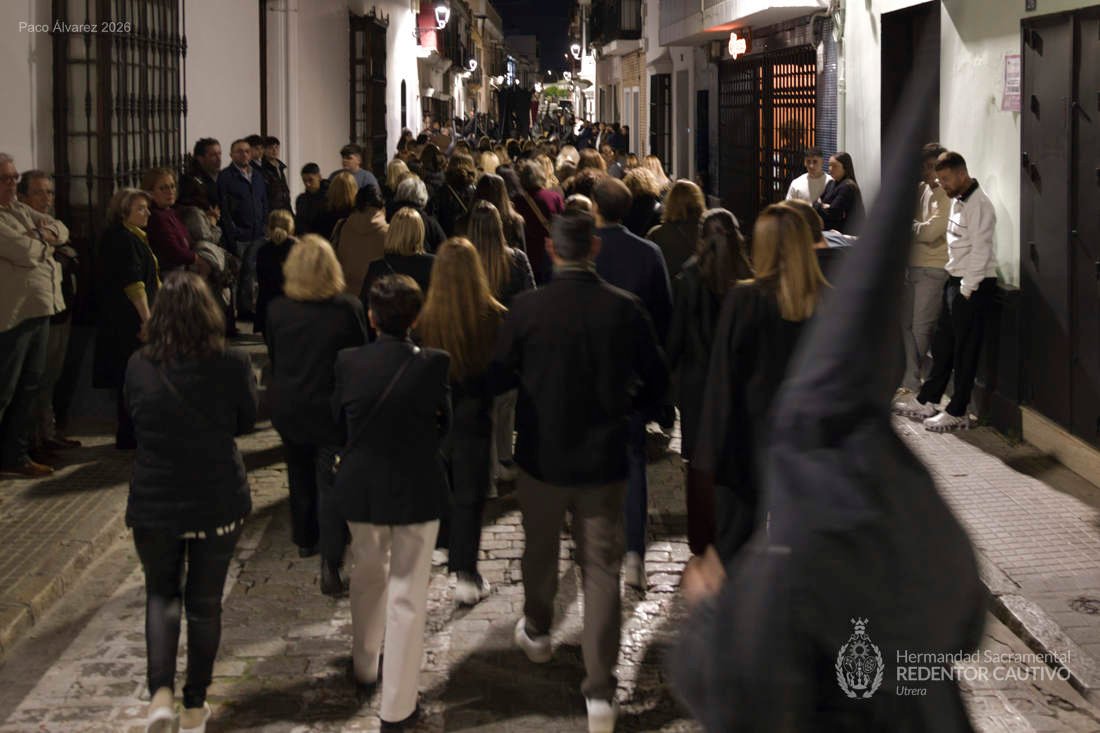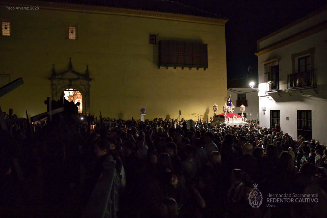 Jesús, Ntro. Padre Jesús Redentor Cautivo, avanza por las calles de Utrera. El mundo, indiferente, apenas detiene su mirada. Él camina en silencio por los senderos de la ingratitud y la injusticia; en sus manos no existe culpa alguna, salvo la del amor sin medida; sus pies desnudos pisan la gélida indiferencia del corazón humano, y su rostro, sereno en medio del dolor, refleja la obediencia perfecta y la redención del género humano.