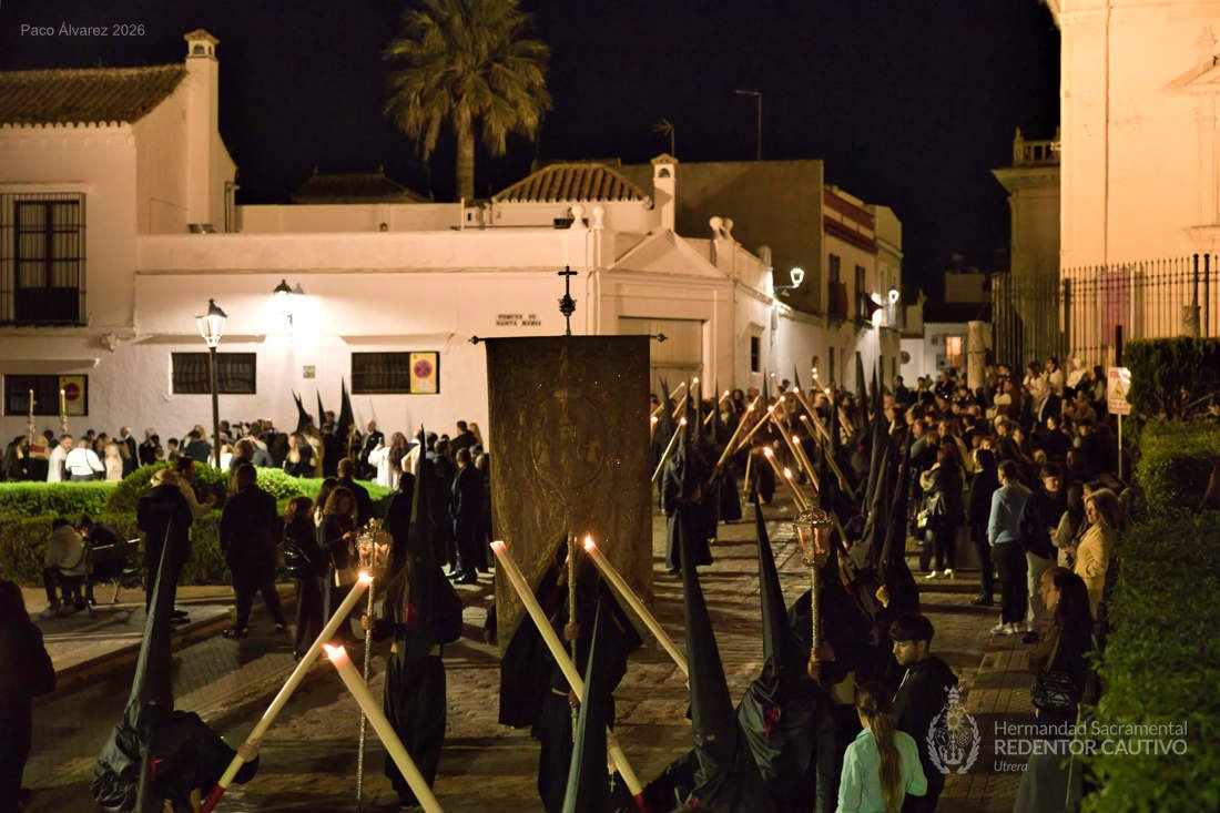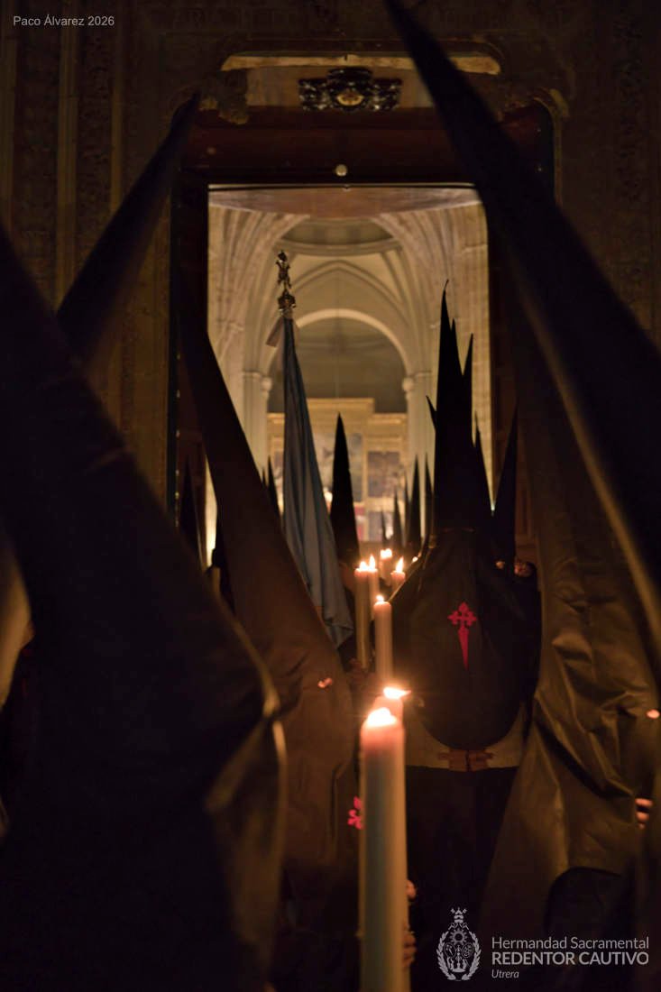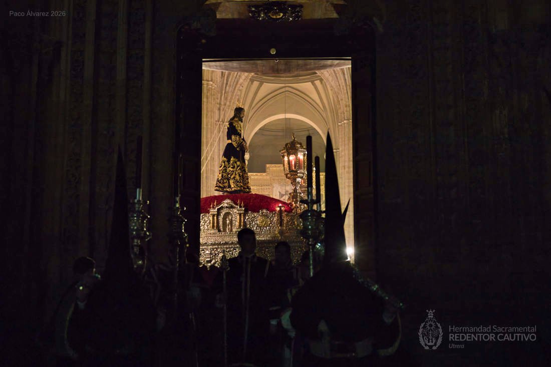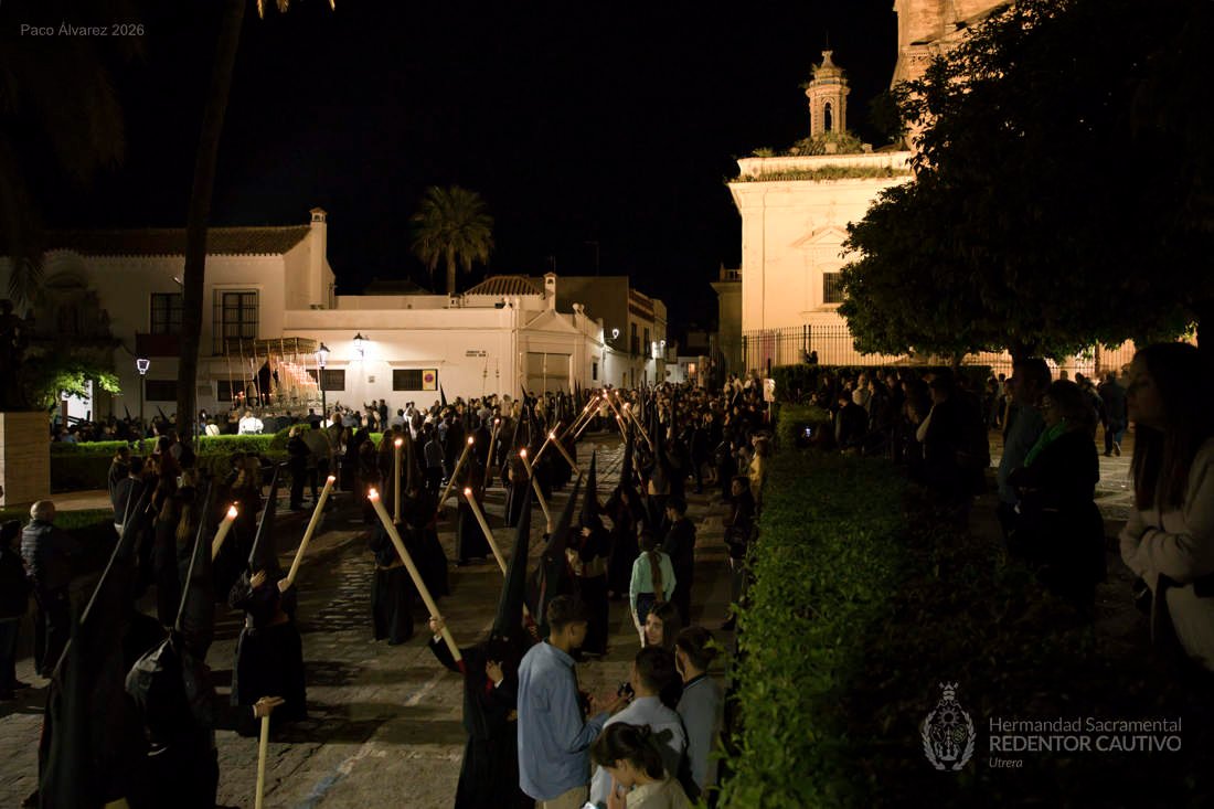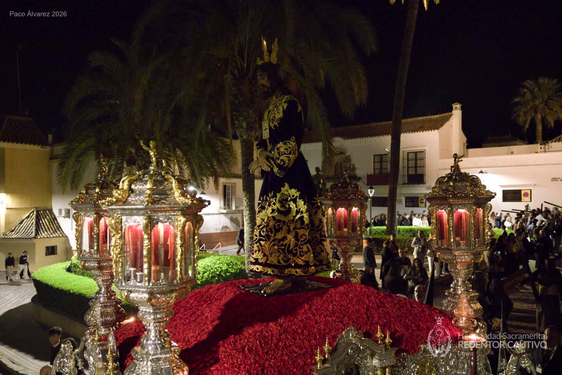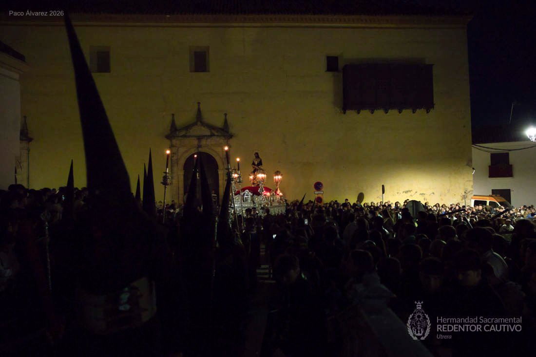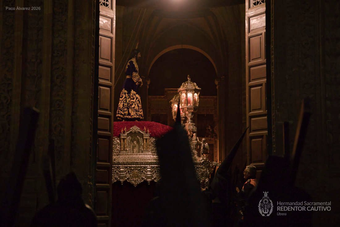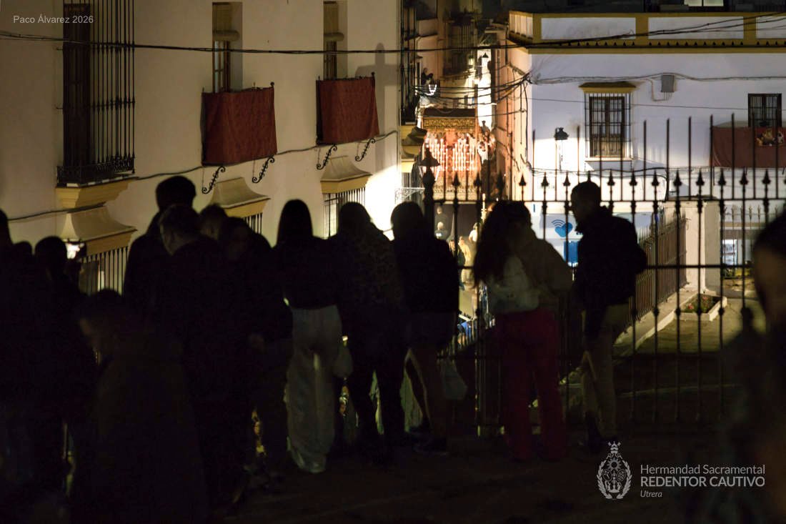 Jesús, Ntro. Padre Jesús Redentor Cautivo, avanza por las calles de Utrera. El mundo, indiferente, apenas detiene su mirada. Él camina en silencio por los senderos de la ingratitud y la injusticia; en sus manos no existe culpa alguna, salvo la del amor sin medida; sus pies desnudos pisan la gélida indiferencia del corazón humano, y su rostro, sereno en medio del dolor, refleja la obediencia perfecta y la redención del género humano.