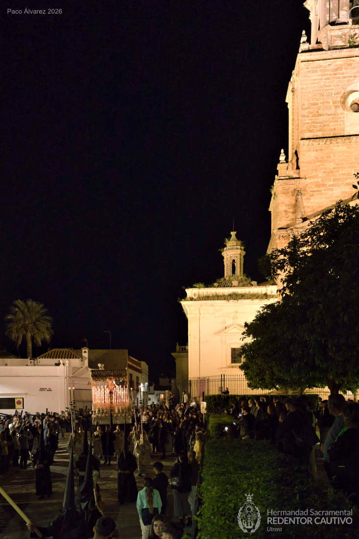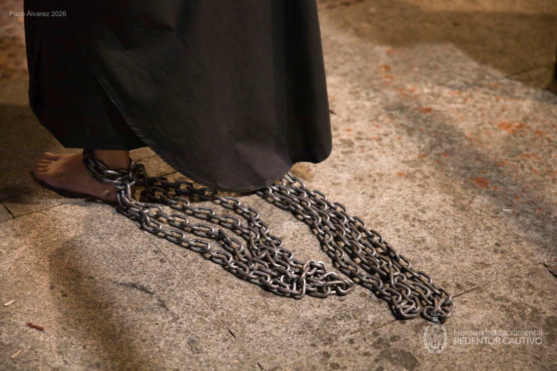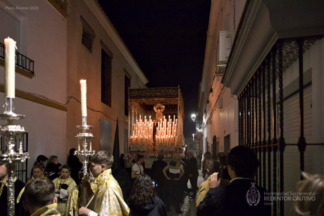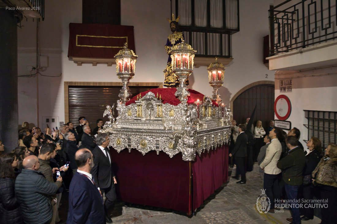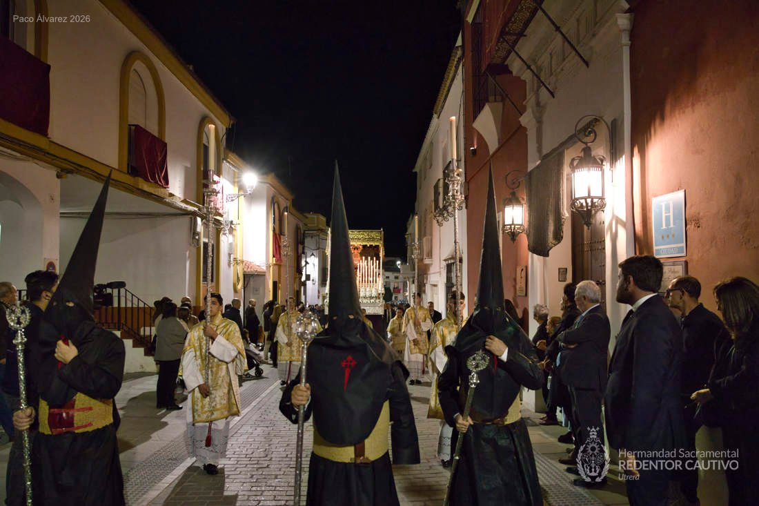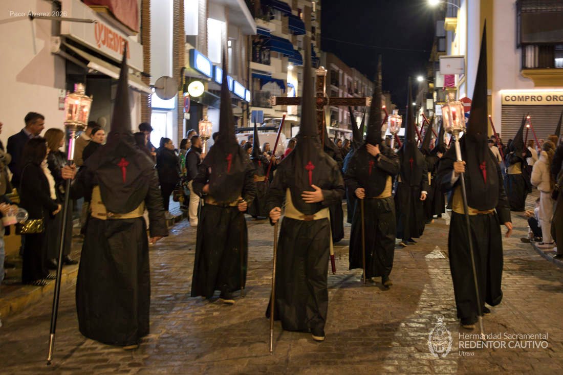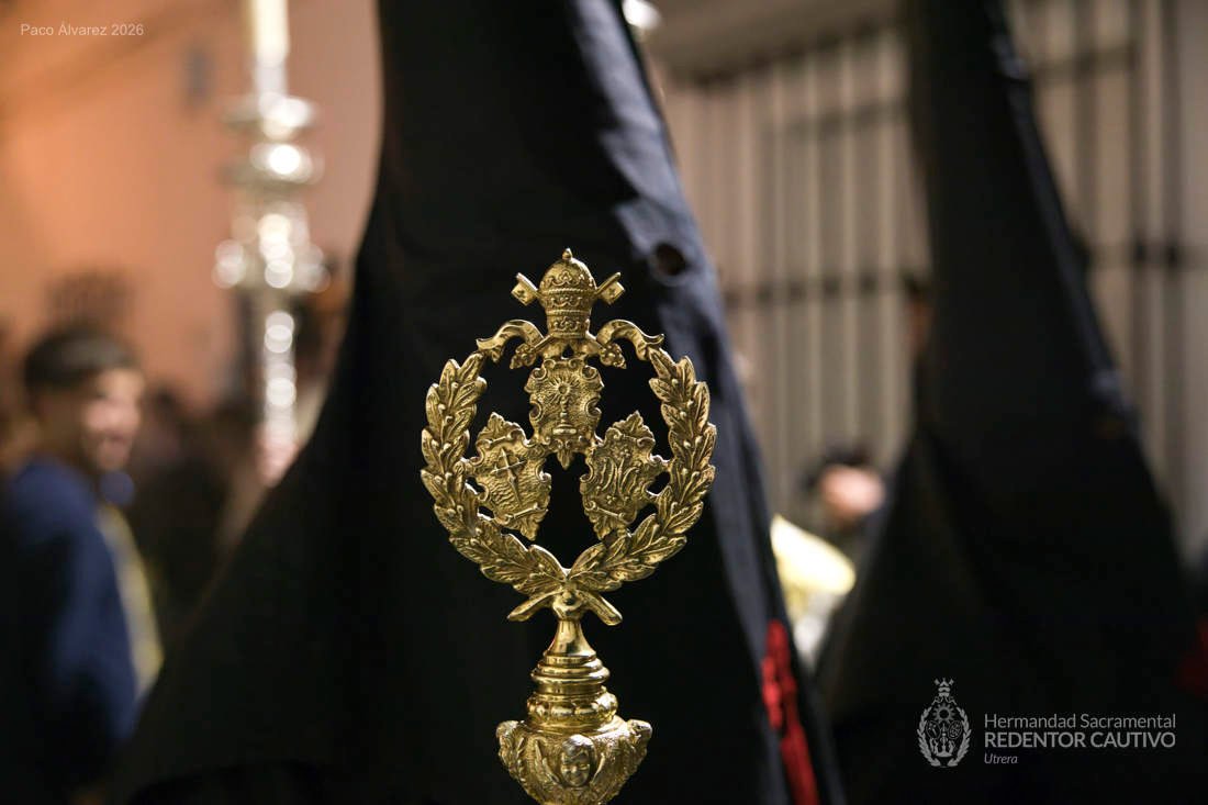 Jesús, Ntro. Padre Jesús Redentor Cautivo, avanza por las calles de Utrera. El mundo, indiferente, apenas detiene su mirada. Él camina en silencio por los senderos de la ingratitud y la injusticia; en sus manos no existe culpa alguna, salvo la del amor sin medida; sus pies desnudos pisan la gélida indiferencia del corazón humano, y su rostro, sereno en medio del dolor, refleja la obediencia perfecta y la redención del género humano.