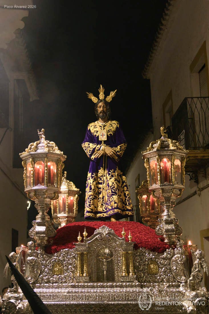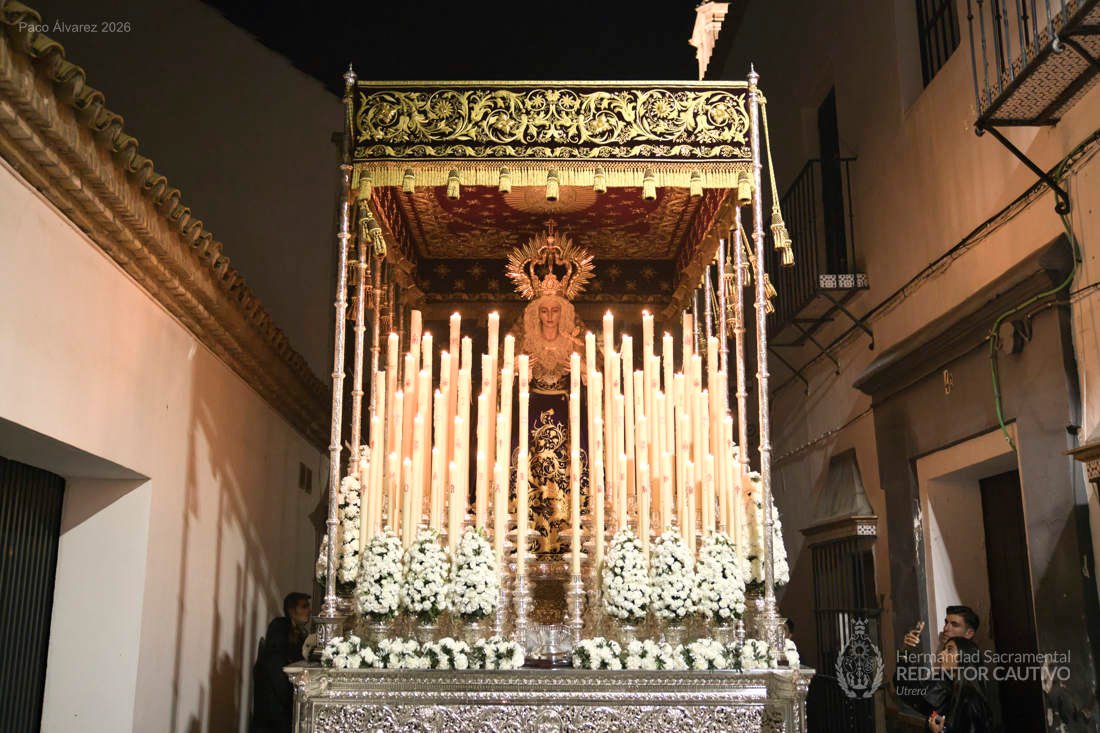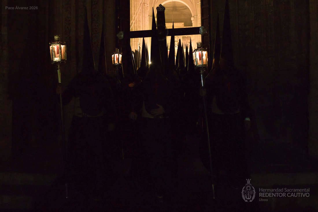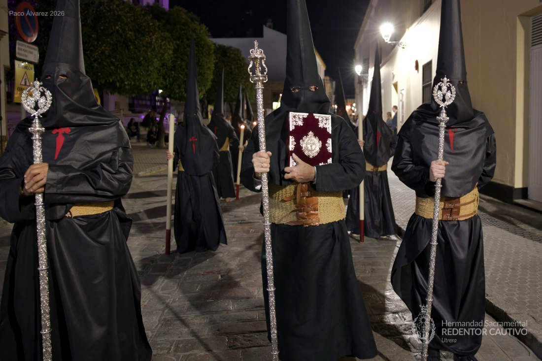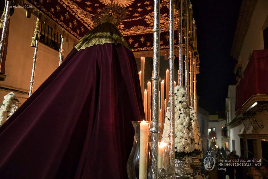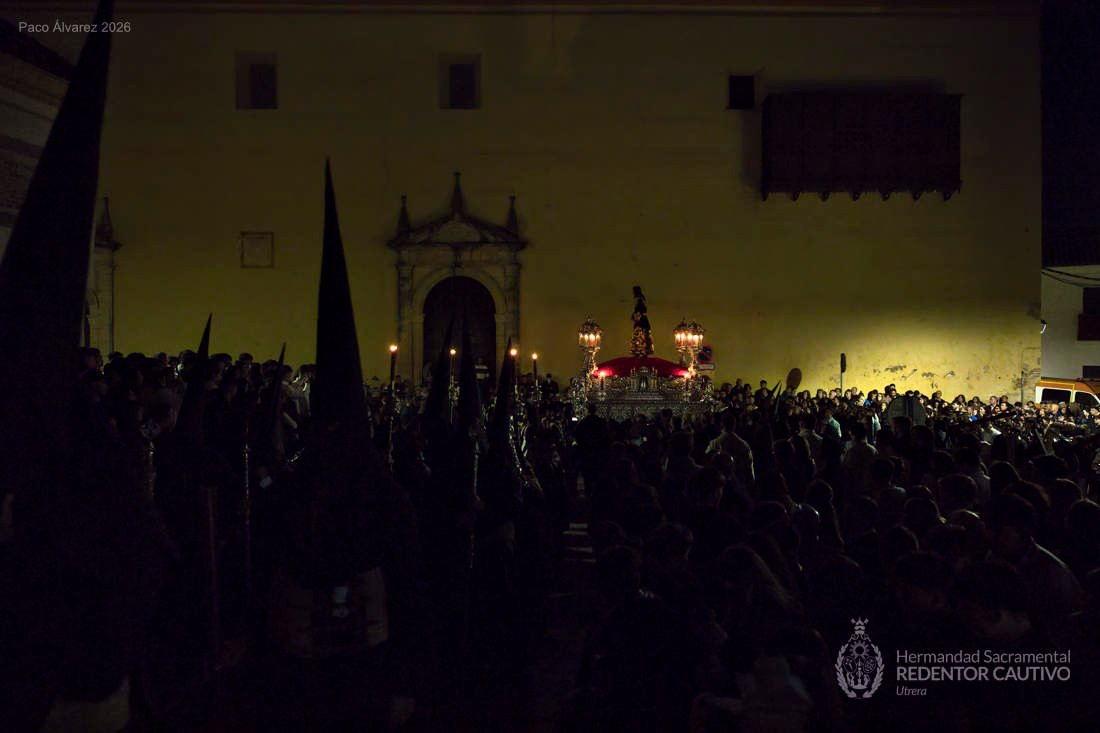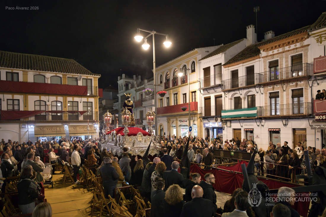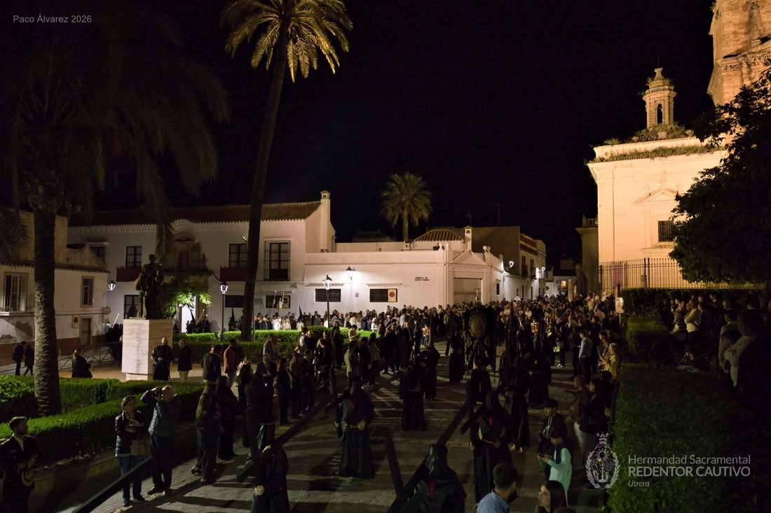 Jesús, Ntro. Padre Jesús Redentor Cautivo, avanza por las calles de Utrera. El mundo, indiferente, apenas detiene su mirada. Él camina en silencio por los senderos de la ingratitud y la injusticia; en sus manos no existe culpa alguna, salvo la del amor sin medida; sus pies desnudos pisan la gélida indiferencia del corazón humano, y su rostro, sereno en medio del dolor, refleja la obediencia perfecta y la redención del género humano.