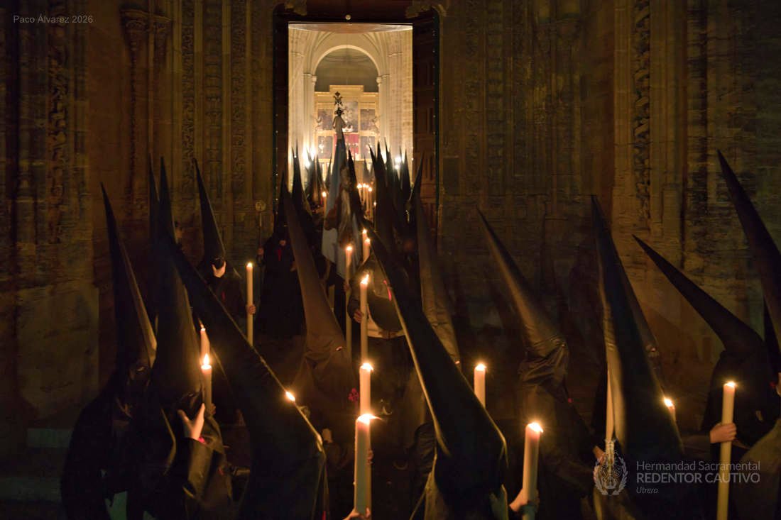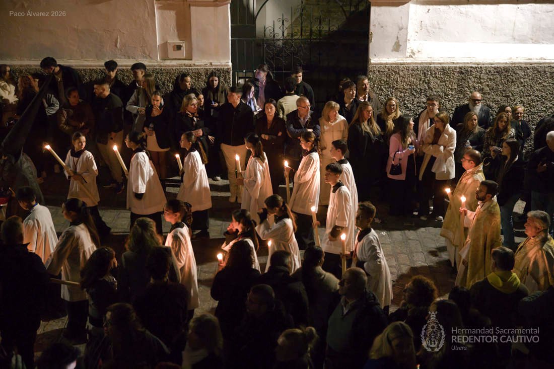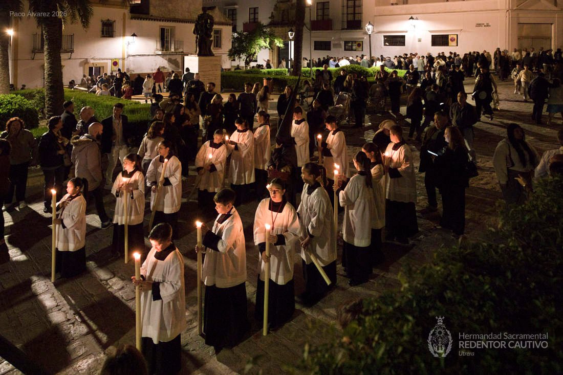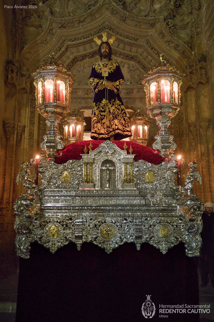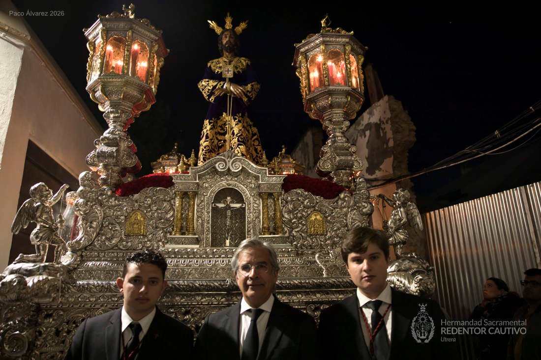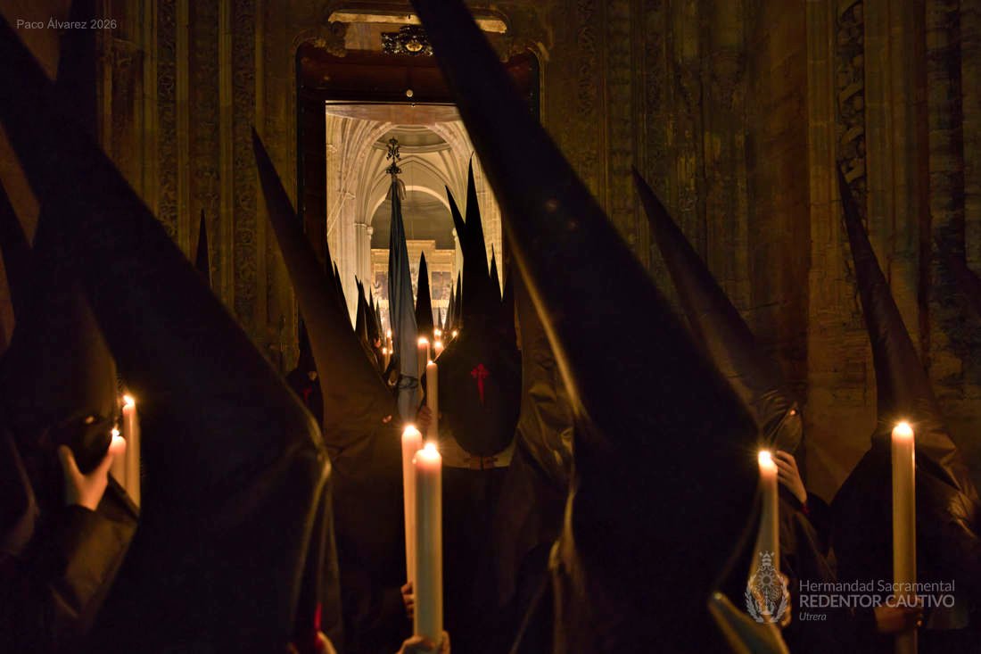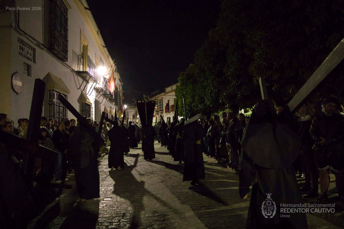 Jesús, Ntro. Padre Jesús Redentor Cautivo, avanza por las calles de Utrera. El mundo, indiferente, apenas detiene su mirada. Él camina en silencio por los senderos de la ingratitud y la injusticia; en sus manos no existe culpa alguna, salvo la del amor sin medida; sus pies desnudos pisan la gélida indiferencia del corazón humano, y su rostro, sereno en medio del dolor, refleja la obediencia perfecta y la redención del género humano.
