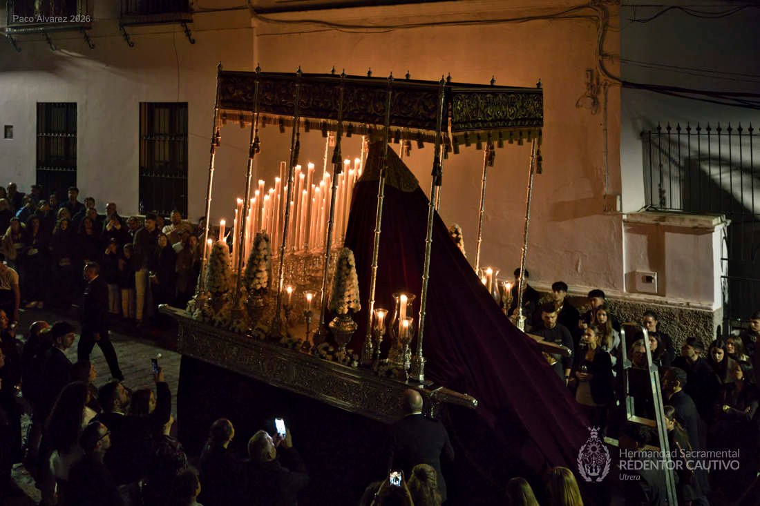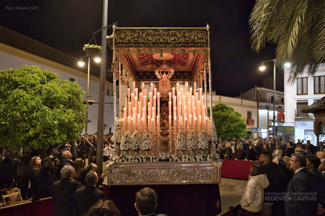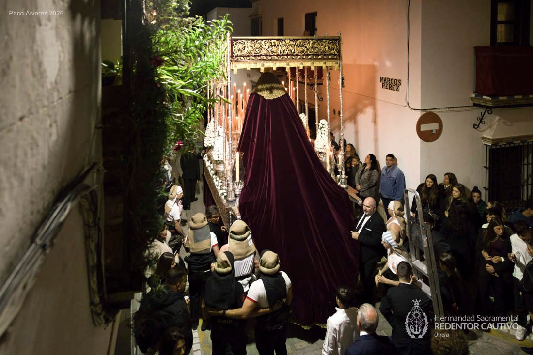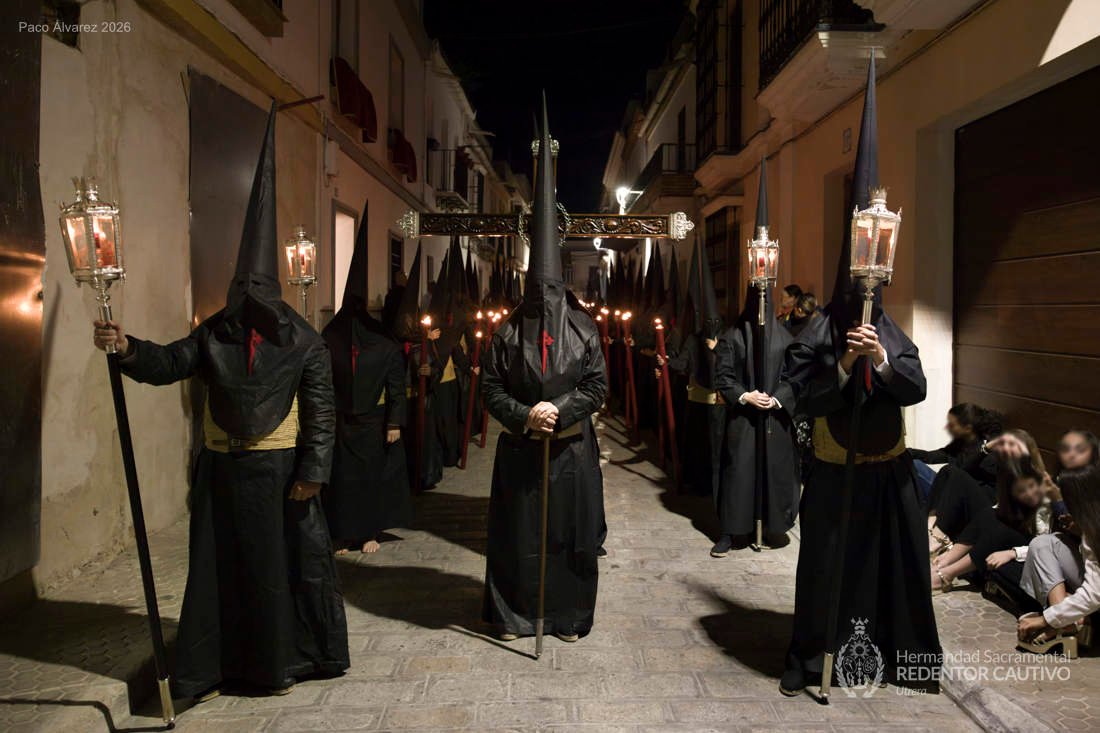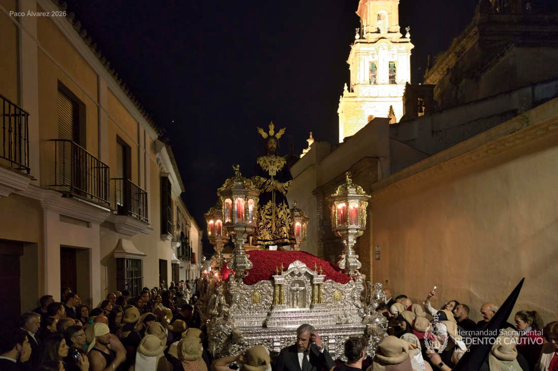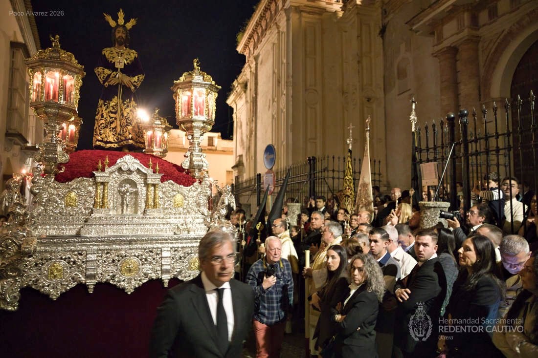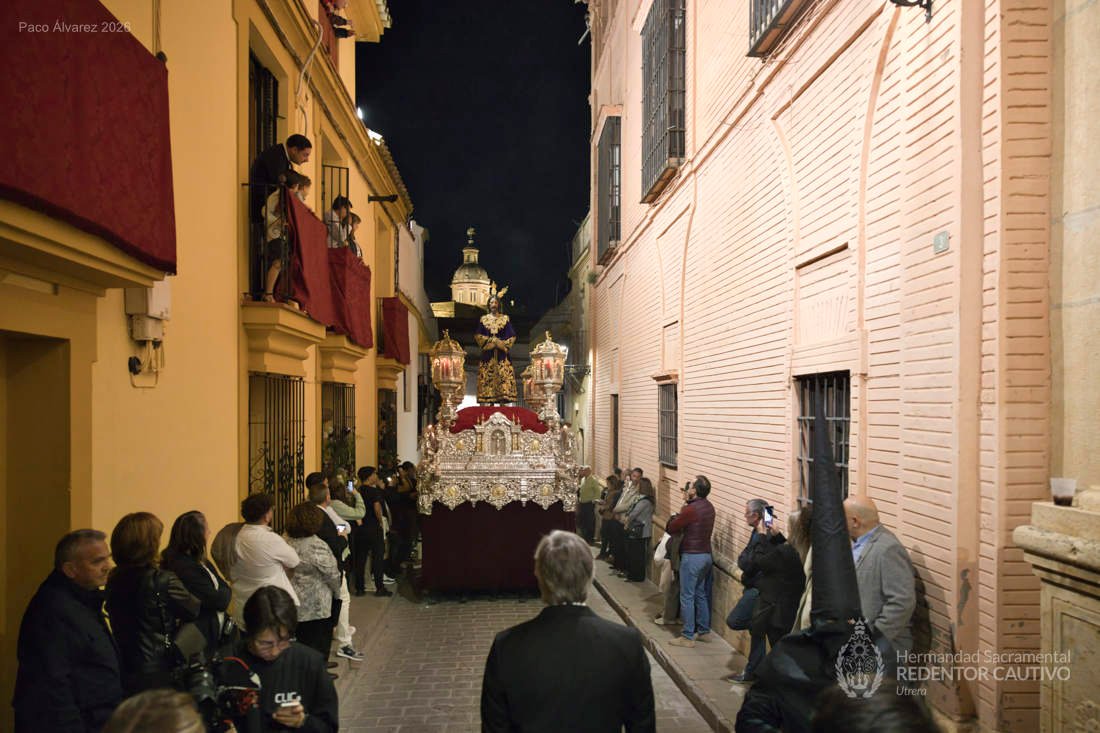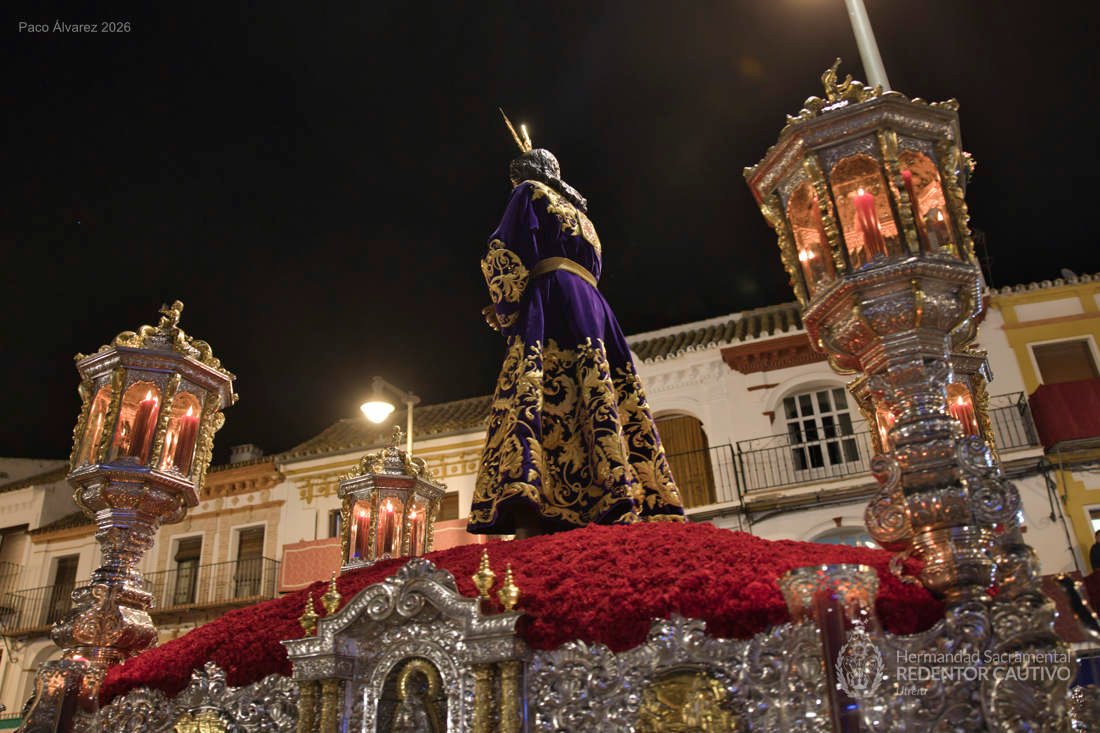 Jesús, Ntro. Padre Jesús Redentor Cautivo, avanza por las calles de Utrera. El mundo, indiferente, apenas detiene su mirada. Él camina en silencio por los senderos de la ingratitud y la injusticia; en sus manos no existe culpa alguna, salvo la del amor sin medida; sus pies desnudos pisan la gélida indiferencia del corazón humano, y su rostro, sereno en medio del dolor, refleja la obediencia perfecta y la redención del género humano.