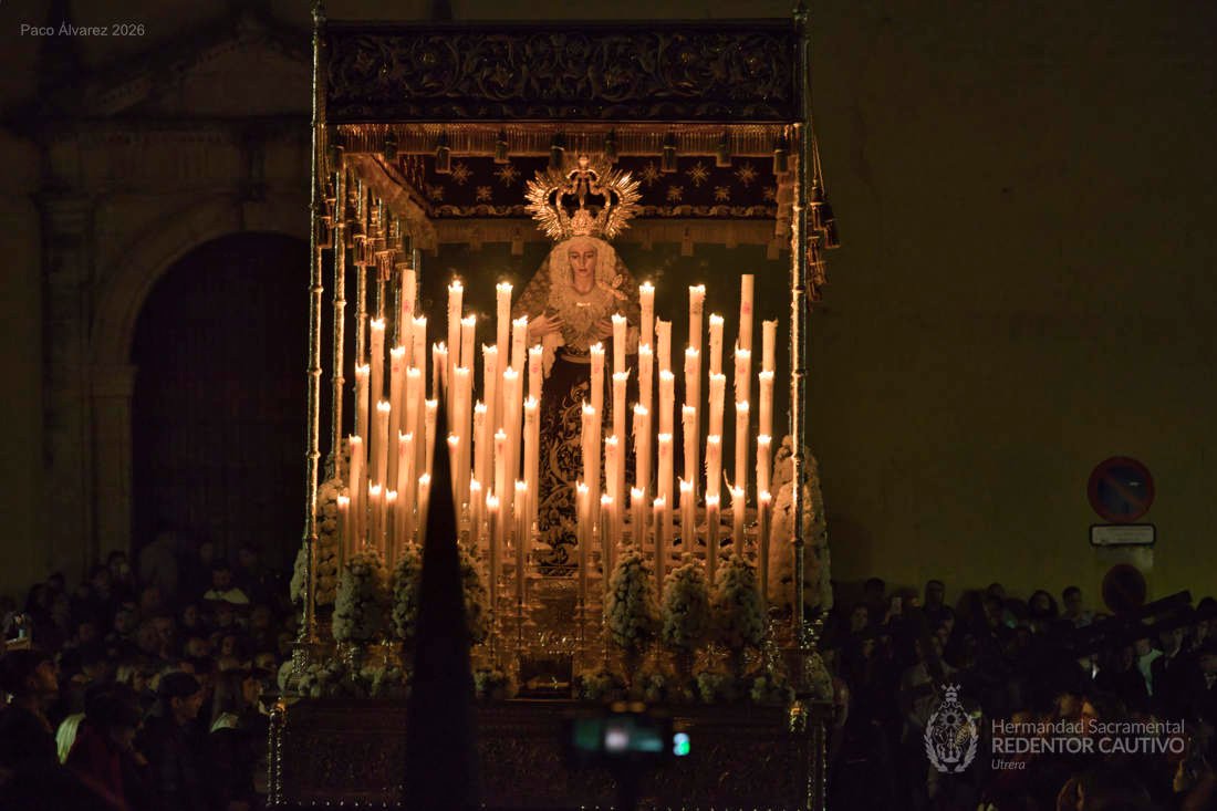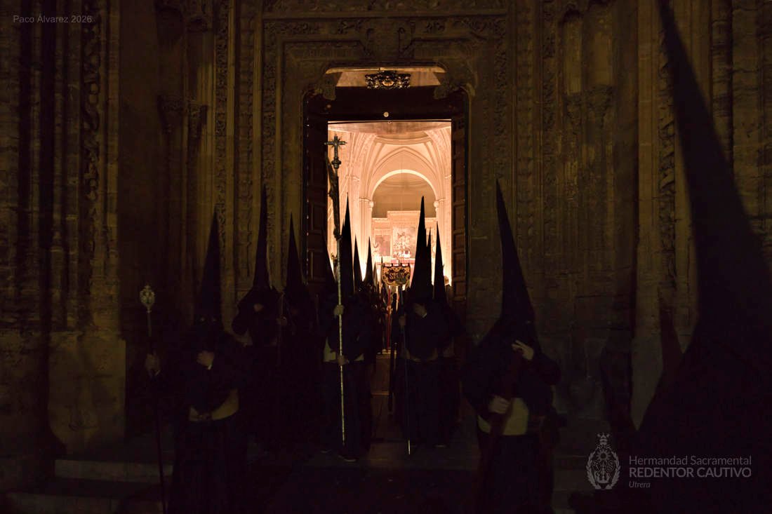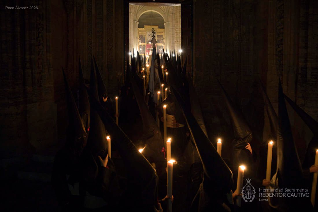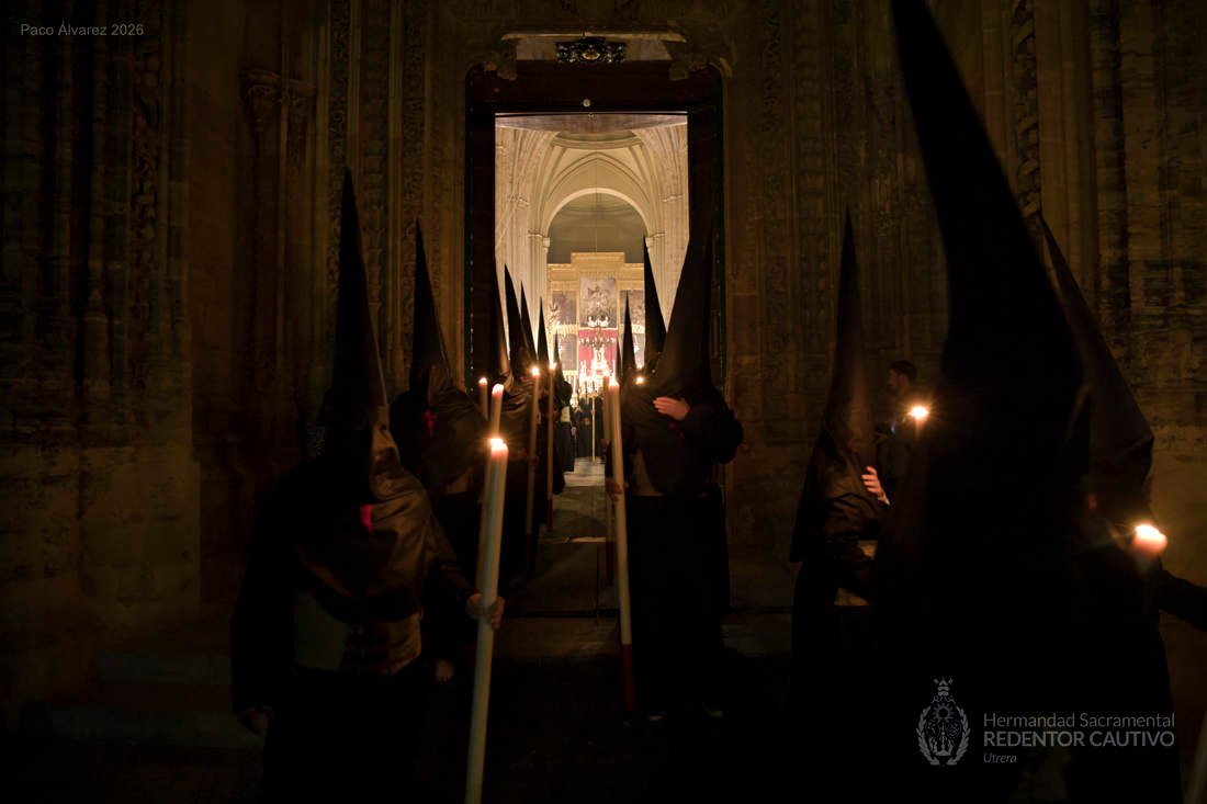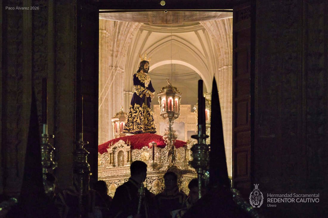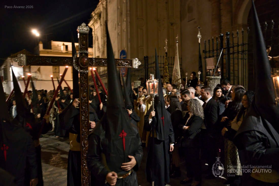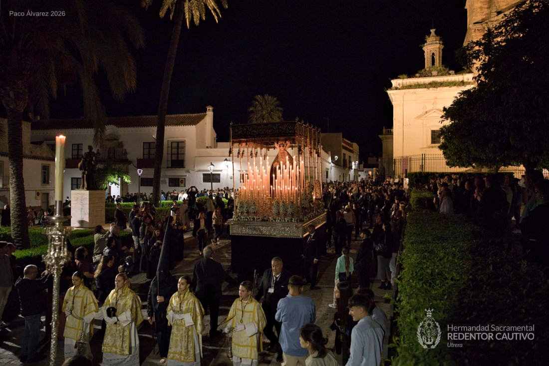 Jesús, Ntro. Padre Jesús Redentor Cautivo, avanza por las calles de Utrera. El mundo, indiferente, apenas detiene su mirada. Él camina en silencio por los senderos de la ingratitud y la injusticia; en sus manos no existe culpa alguna, salvo la del amor sin medida; sus pies desnudos pisan la gélida indiferencia del corazón humano, y su rostro, sereno en medio del dolor, refleja la obediencia perfecta y la redención del género humano.