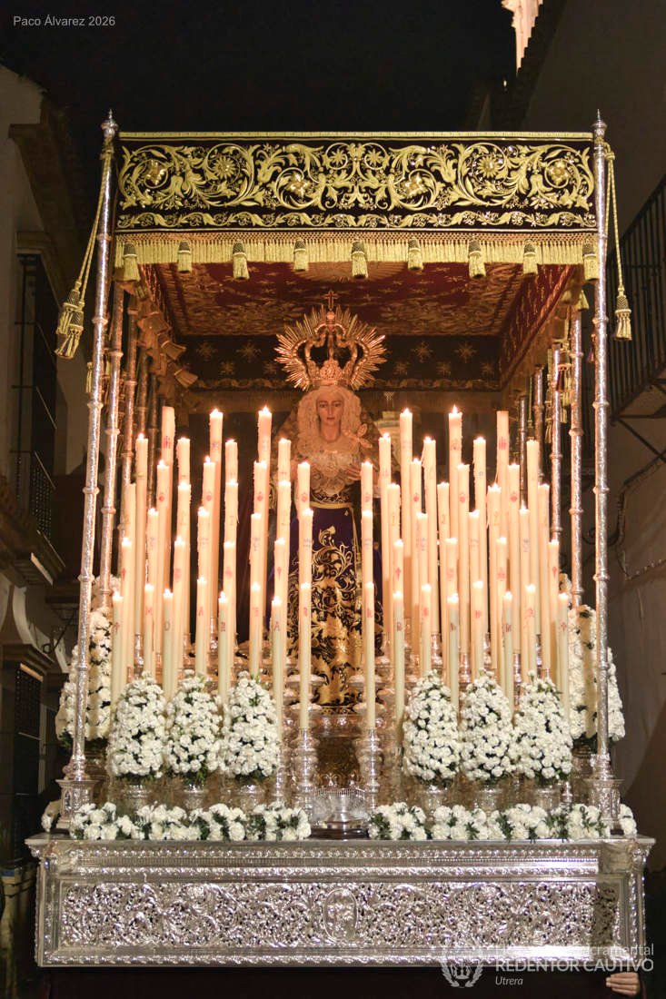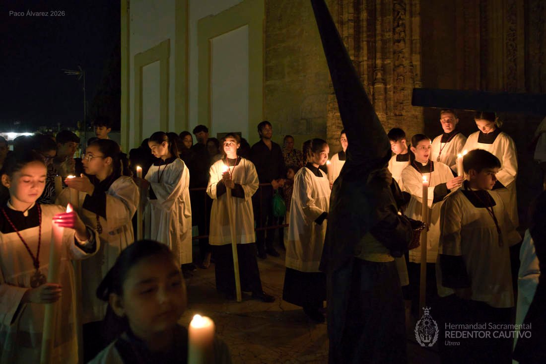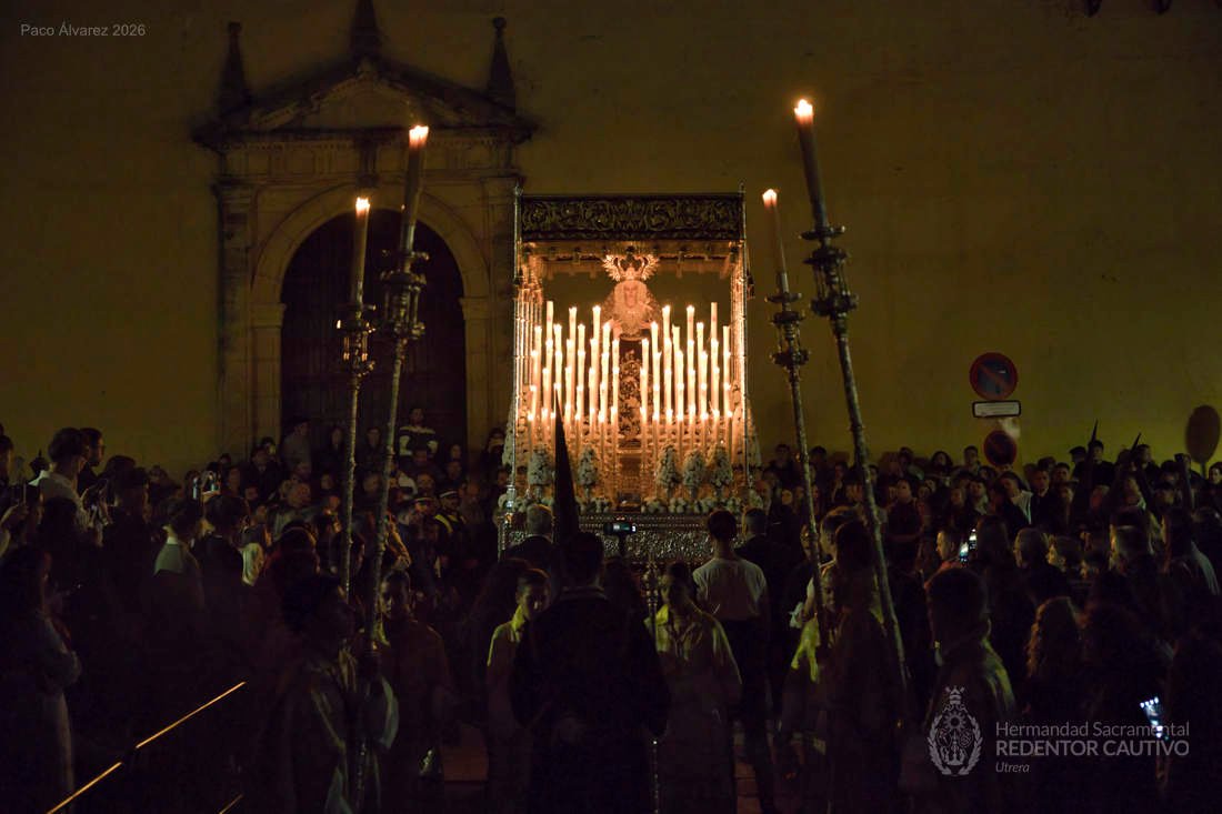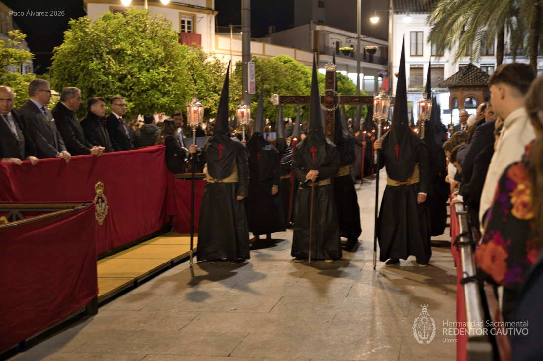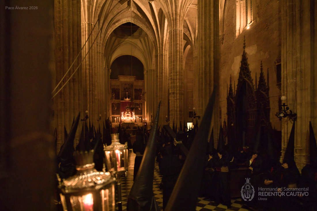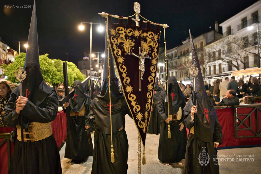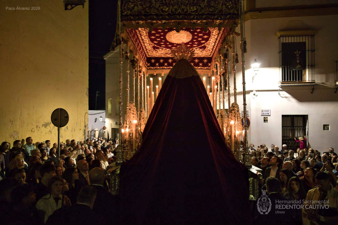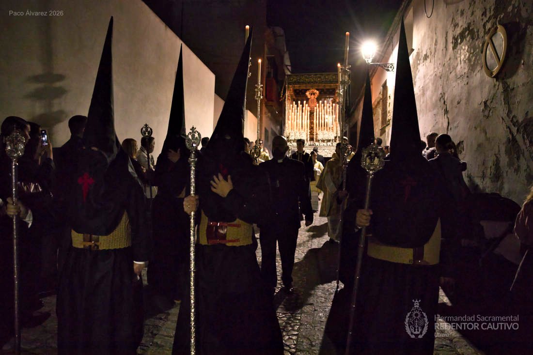 Jesús, Ntro. Padre Jesús Redentor Cautivo, avanza por las calles de Utrera. El mundo, indiferente, apenas detiene su mirada. Él camina en silencio por los senderos de la ingratitud y la injusticia; en sus manos no existe culpa alguna, salvo la del amor sin medida; sus pies desnudos pisan la gélida indiferencia del corazón humano, y su rostro, sereno en medio del dolor, refleja la obediencia perfecta y la redención del género humano.