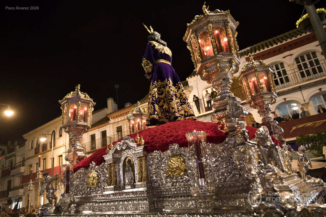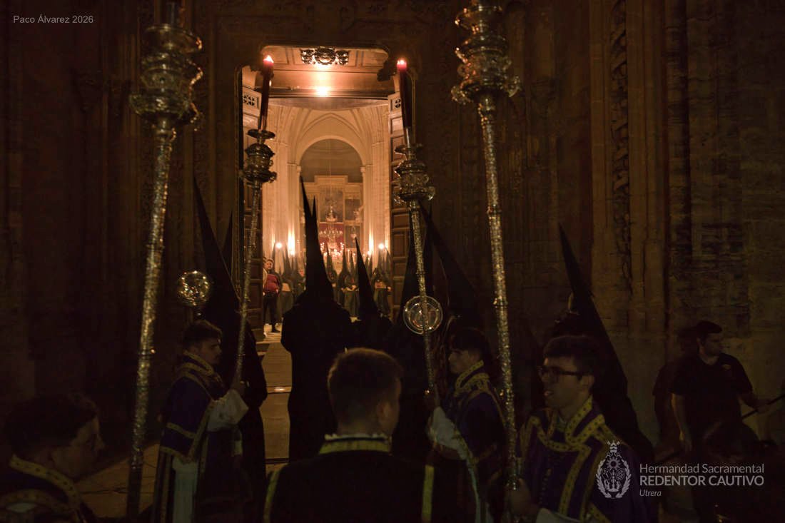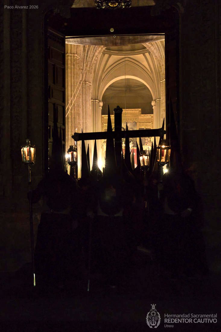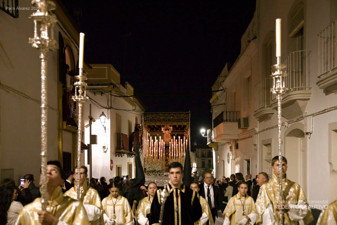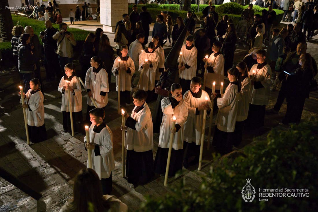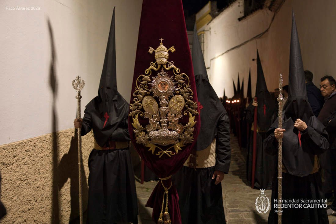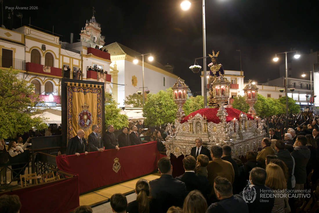Jesús, Ntro. Padre Jesús Redentor Cautivo, avanza por las calles de Utrera. El mundo, indiferente, apenas detiene su mirada. Él camina en silencio por los senderos de la ingratitud y la injusticia; en sus manos no existe culpa alguna, salvo la del amor sin medida; sus pies desnudos pisan la gélida indiferencia del corazón humano, y su rostro, sereno en medio del dolor, refleja la obediencia perfecta y la redención del género humano.