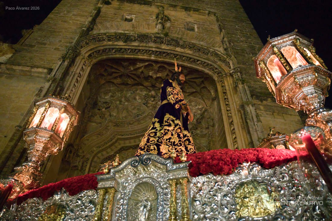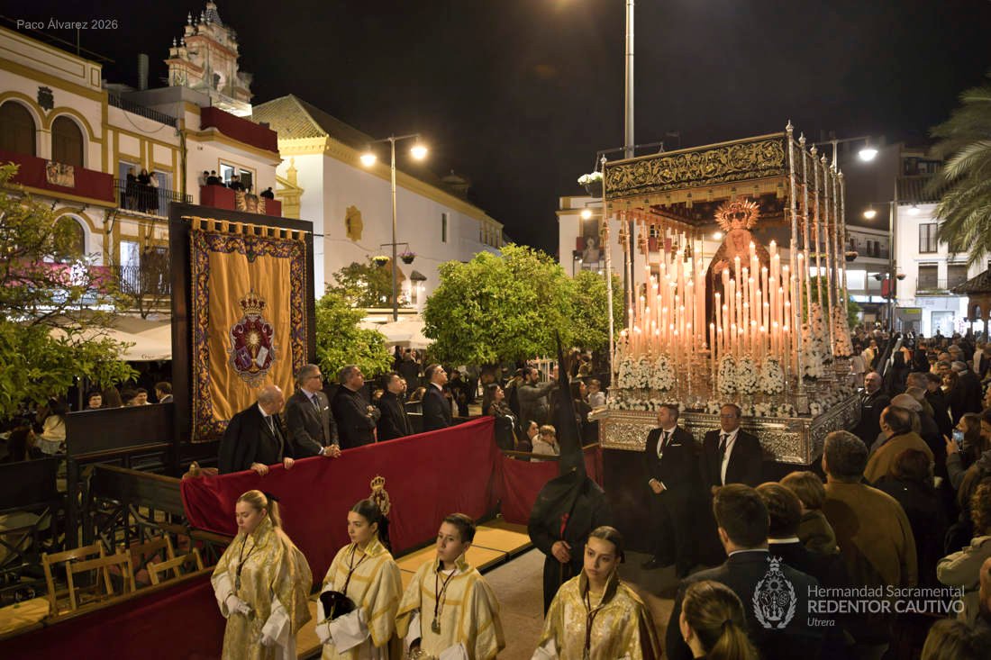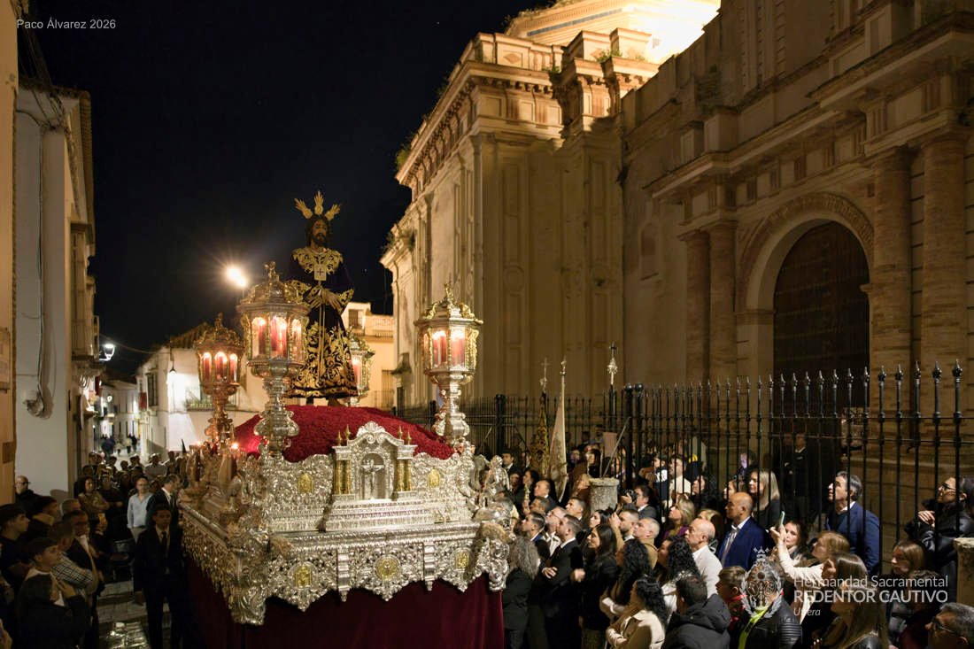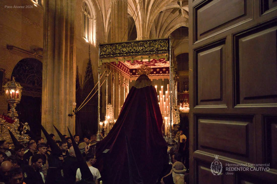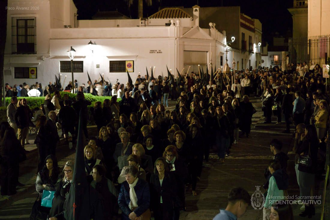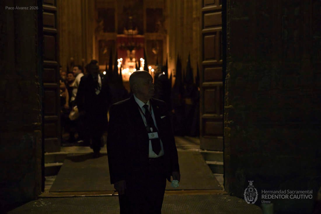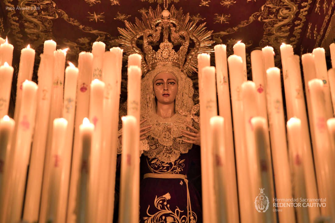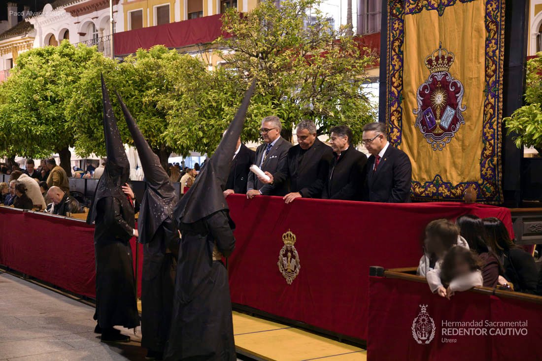 Jesús, Ntro. Padre Jesús Redentor Cautivo, avanza por las calles de Utrera. El mundo, indiferente, apenas detiene su mirada. Él camina en silencio por los senderos de la ingratitud y la injusticia; en sus manos no existe culpa alguna, salvo la del amor sin medida; sus pies desnudos pisan la gélida indiferencia del corazón humano, y su rostro, sereno en medio del dolor, refleja la obediencia perfecta y la redención del género humano.