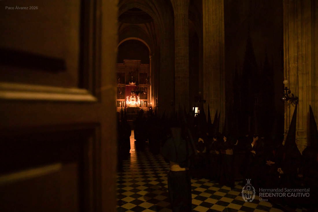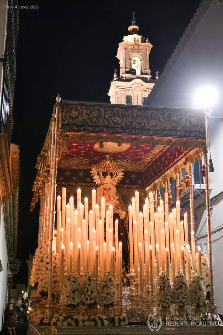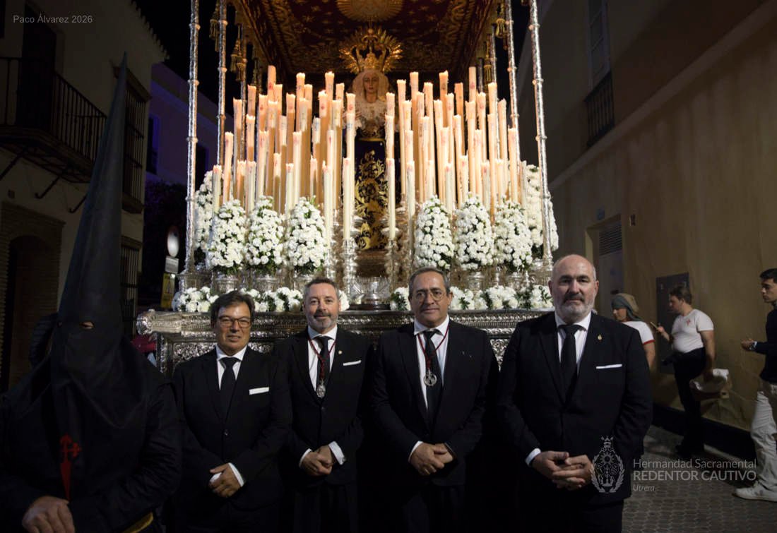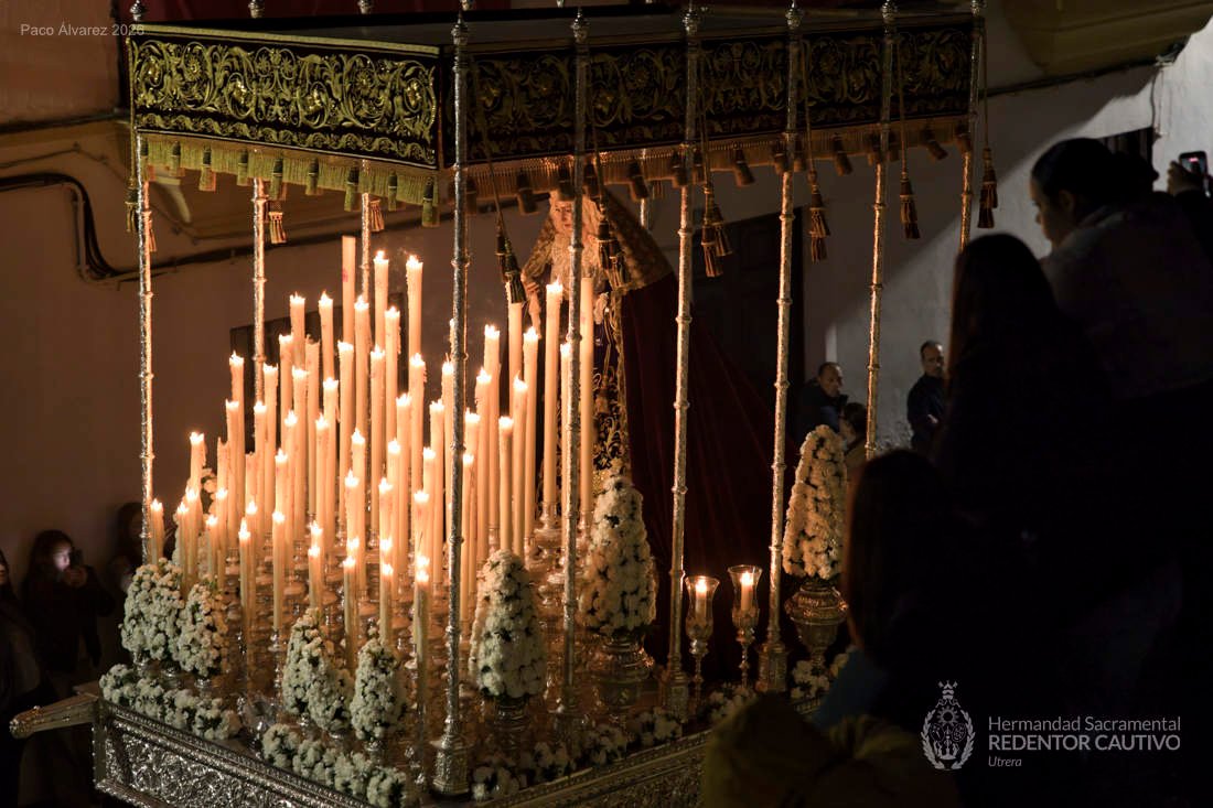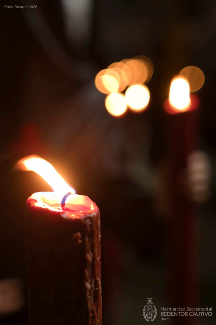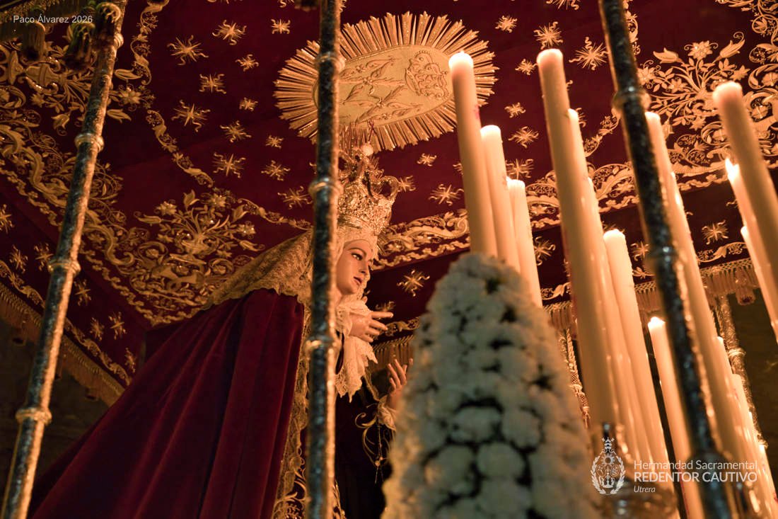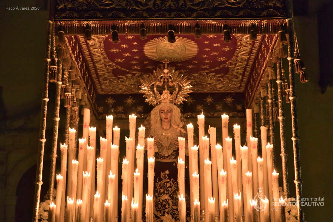 Jesús, Ntro. Padre Jesús Redentor Cautivo, avanza por las calles de Utrera. El mundo, indiferente, apenas detiene su mirada. Él camina en silencio por los senderos de la ingratitud y la injusticia; en sus manos no existe culpa alguna, salvo la del amor sin medida; sus pies desnudos pisan la gélida indiferencia del corazón humano, y su rostro, sereno en medio del dolor, refleja la obediencia perfecta y la redención del género humano.