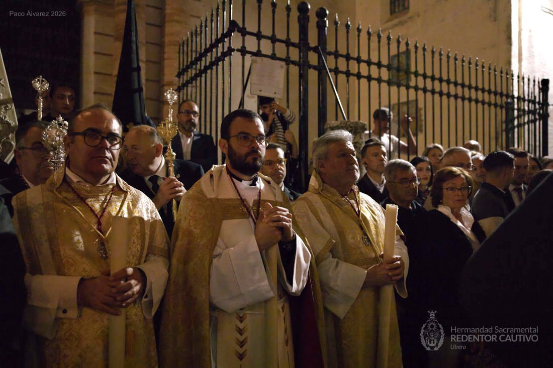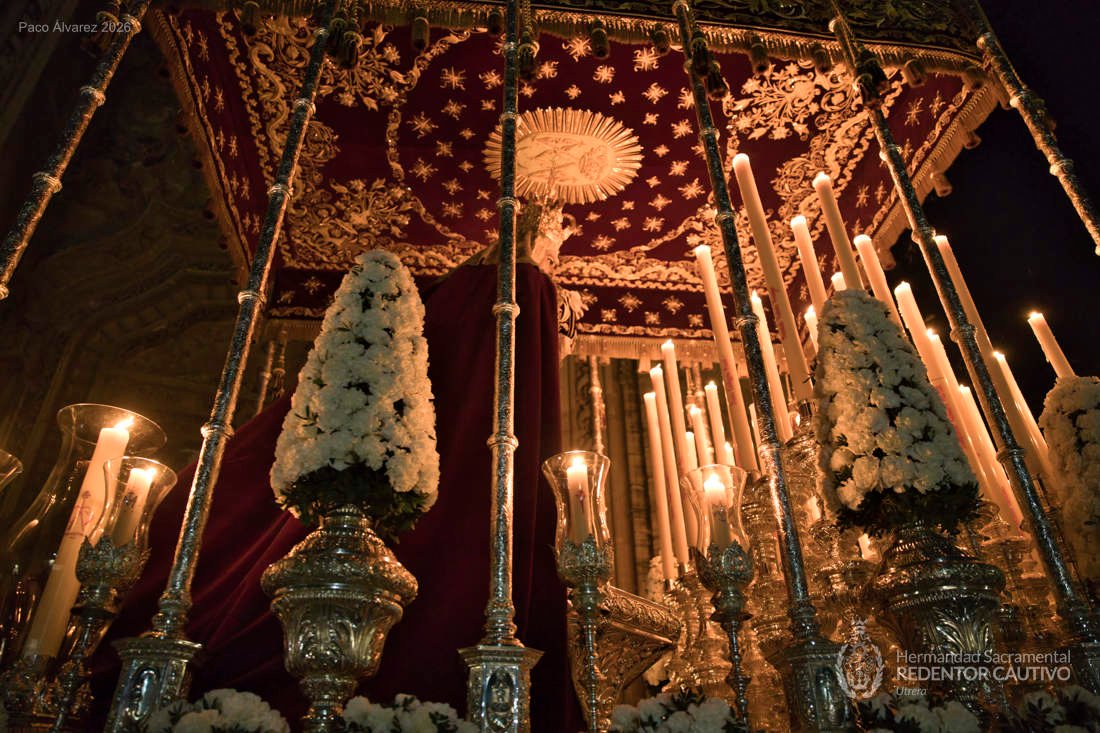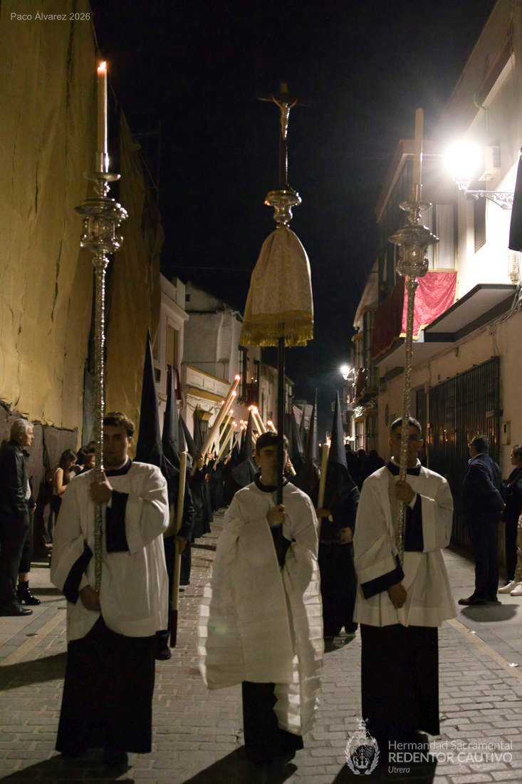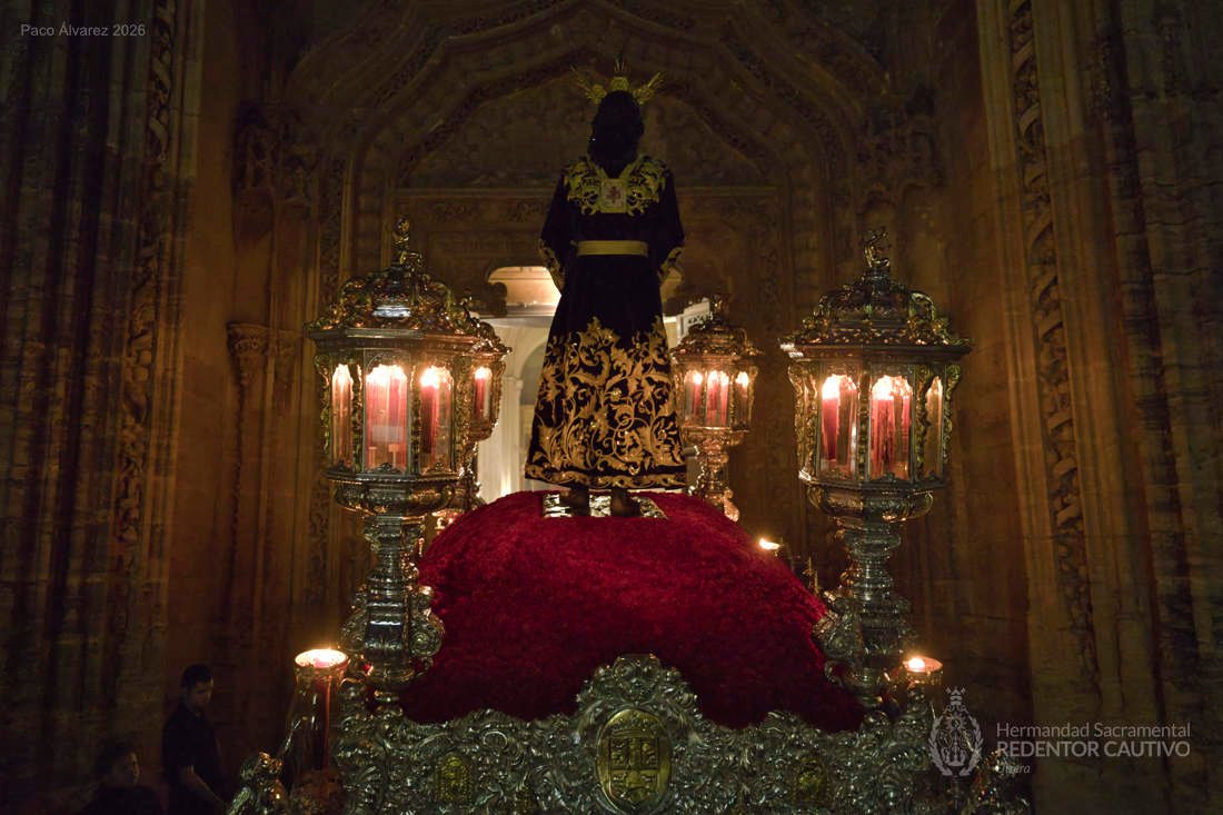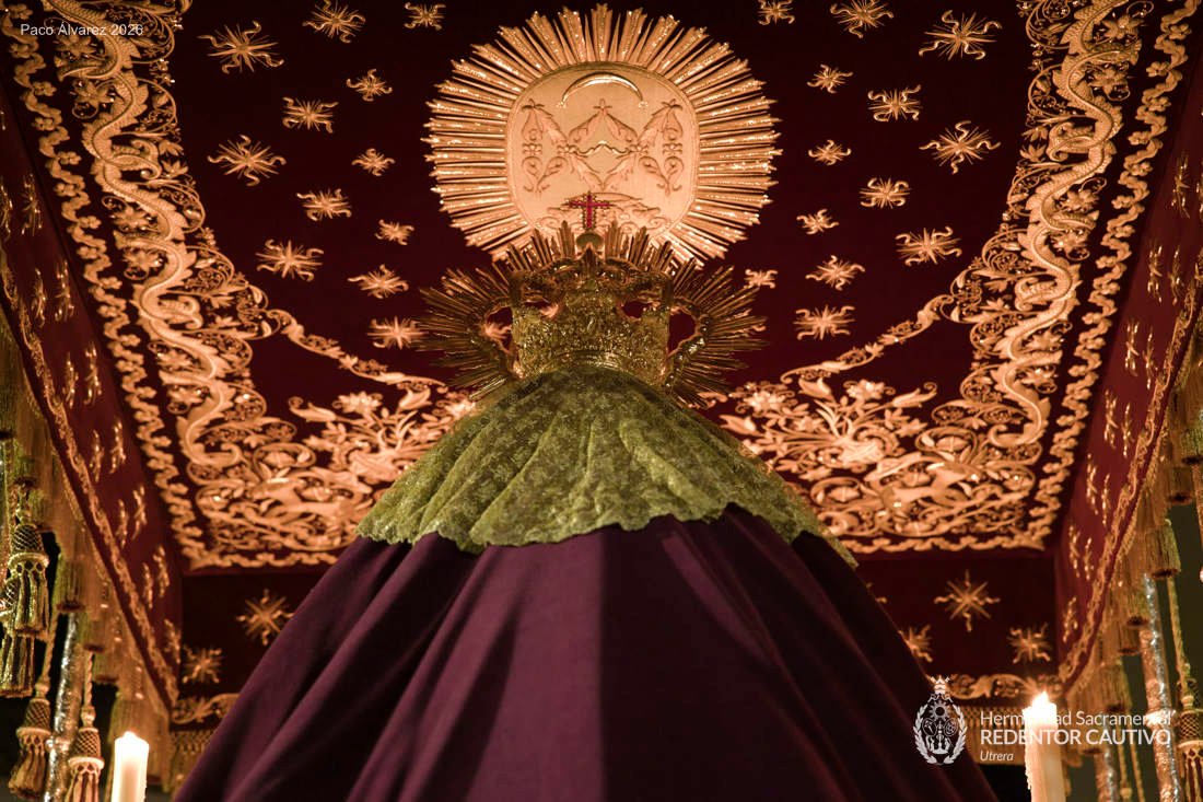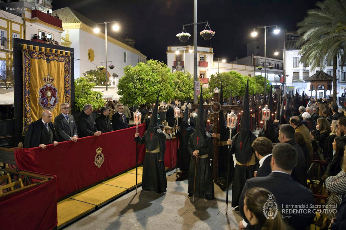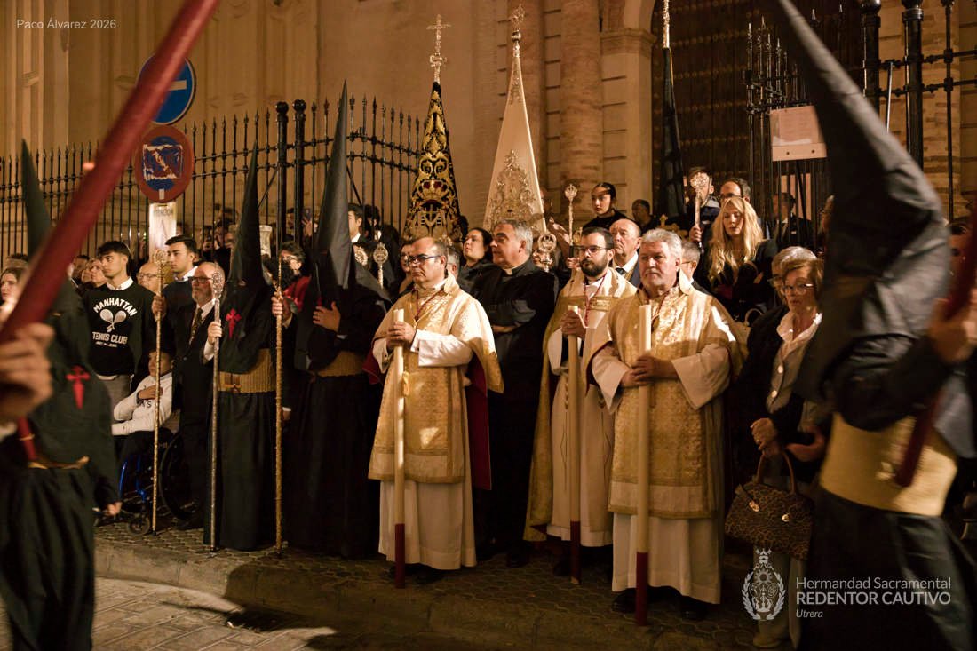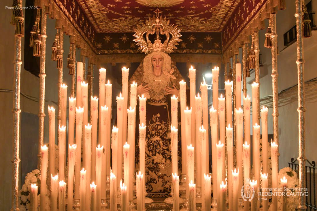 Jesús, Ntro. Padre Jesús Redentor Cautivo, avanza por las calles de Utrera. El mundo, indiferente, apenas detiene su mirada. Él camina en silencio por los senderos de la ingratitud y la injusticia; en sus manos no existe culpa alguna, salvo la del amor sin medida; sus pies desnudos pisan la gélida indiferencia del corazón humano, y su rostro, sereno en medio del dolor, refleja la obediencia perfecta y la redención del género humano.