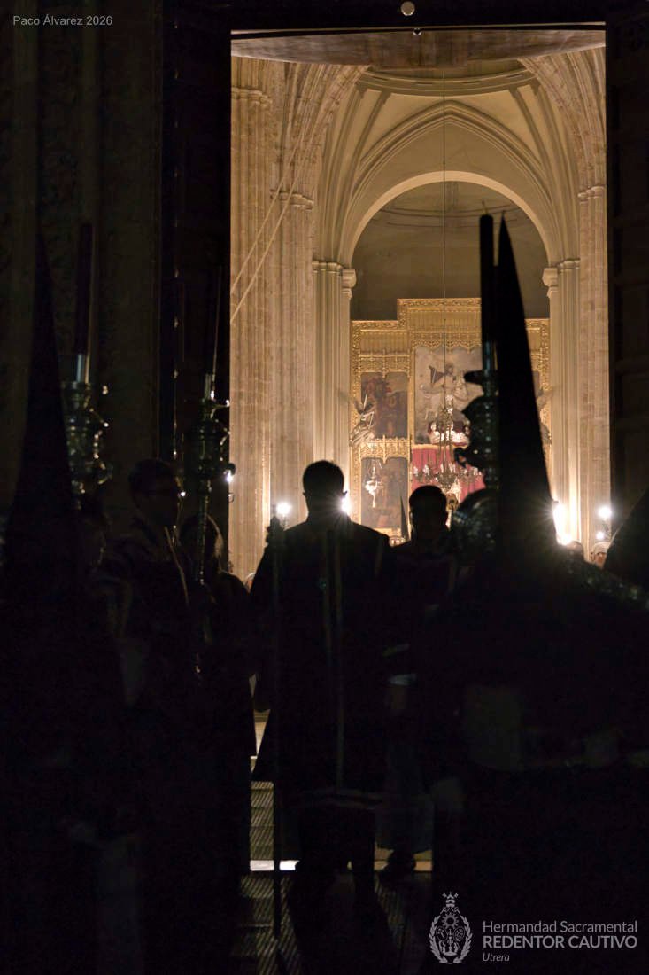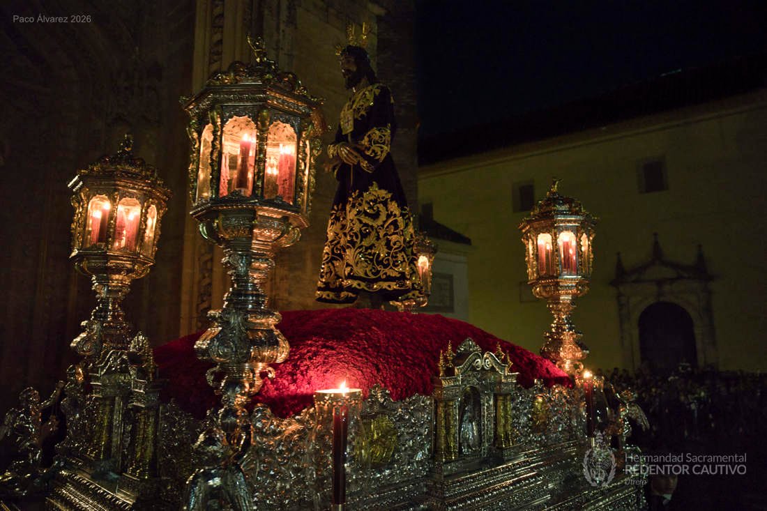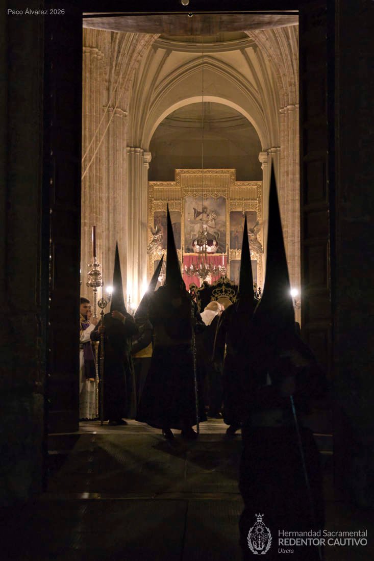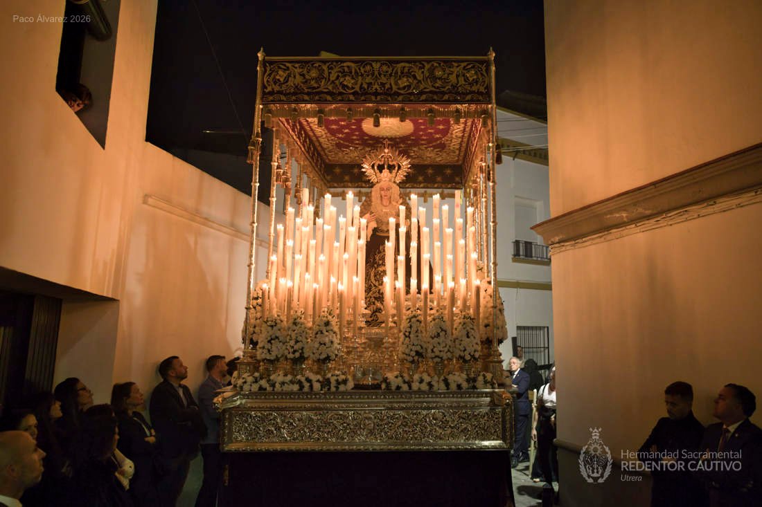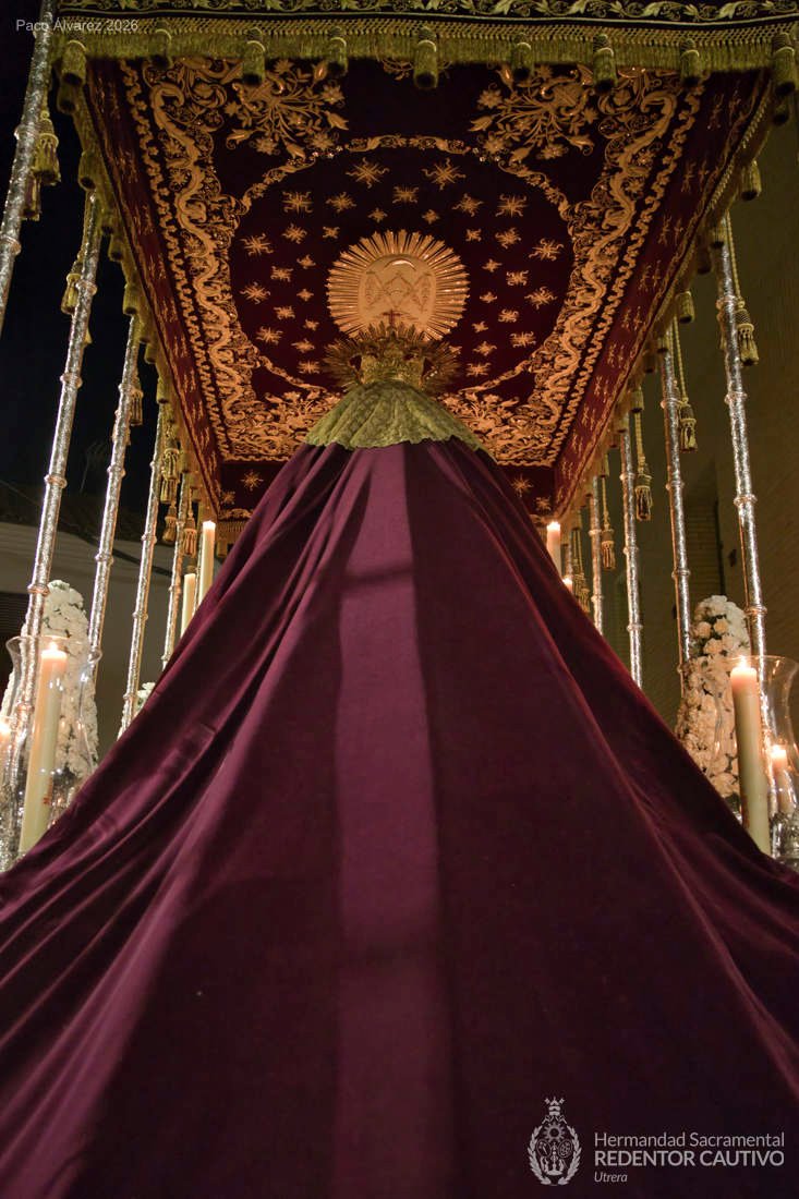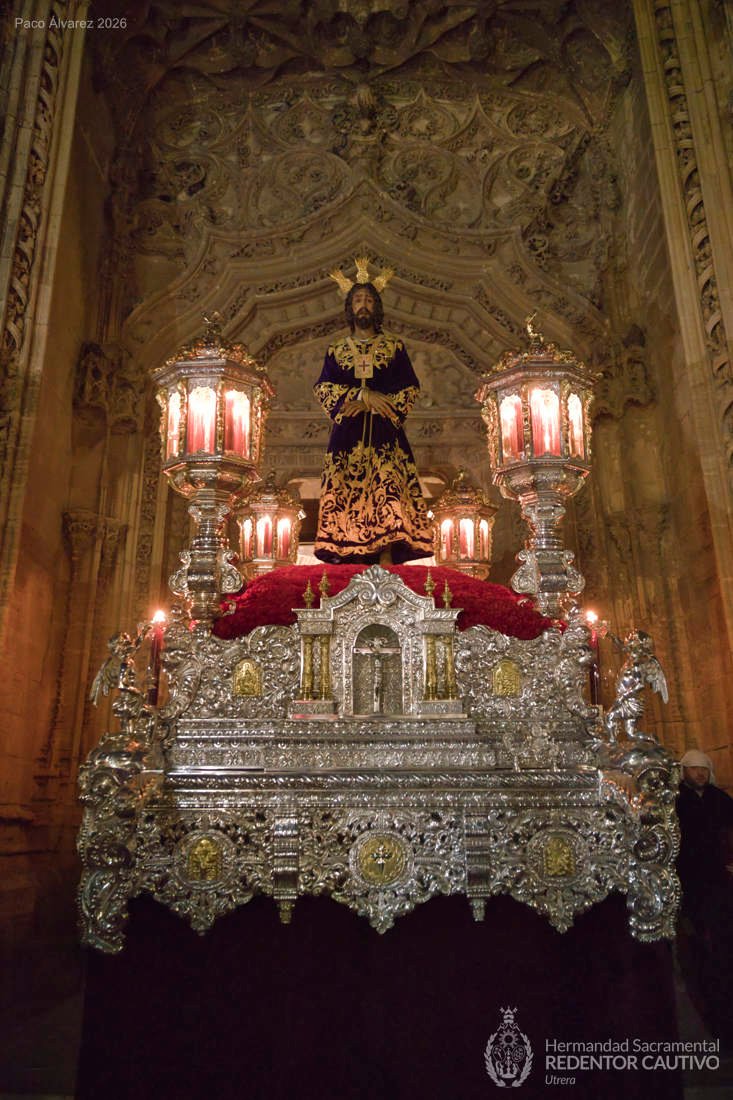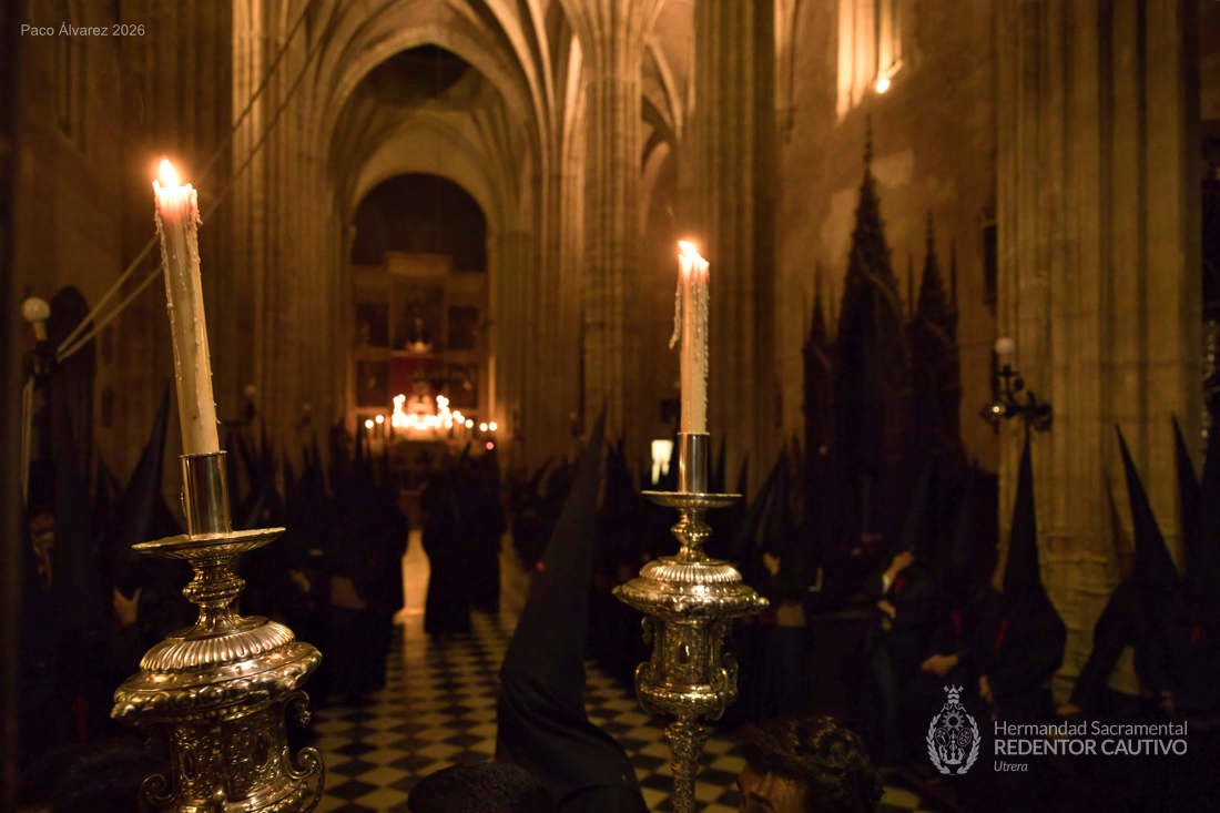 Jesús, Ntro. Padre Jesús Redentor Cautivo, avanza por las calles de Utrera. El mundo, indiferente, apenas detiene su mirada. Él camina en silencio por los senderos de la ingratitud y la injusticia; en sus manos no existe culpa alguna, salvo la del amor sin medida; sus pies desnudos pisan la gélida indiferencia del corazón humano, y su rostro, sereno en medio del dolor, refleja la obediencia perfecta y la redención del género humano.