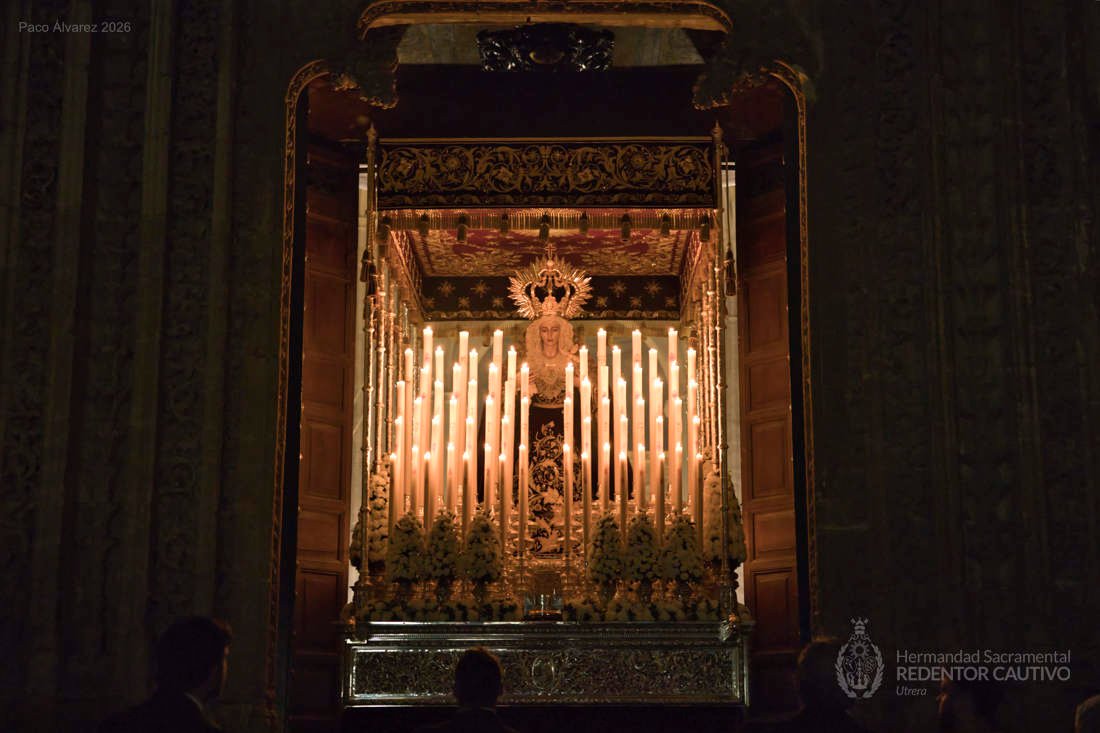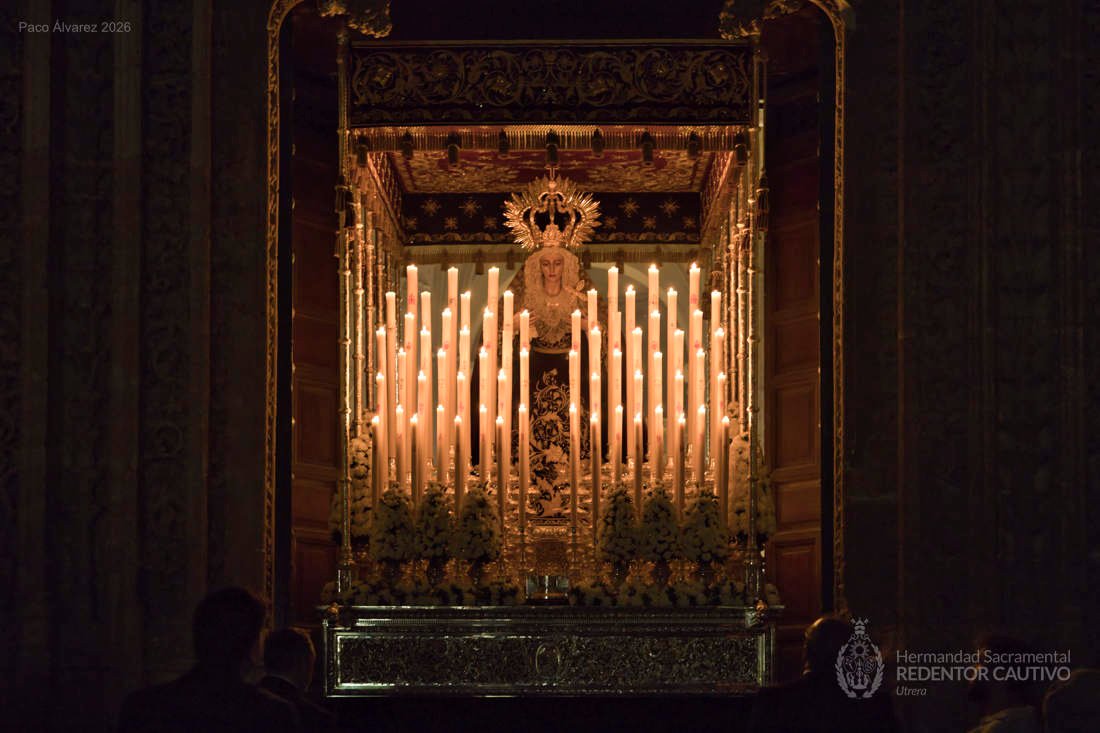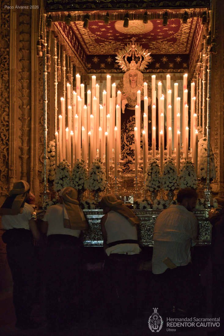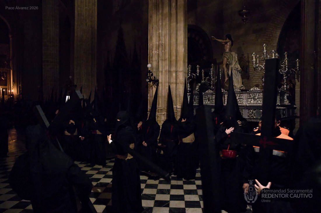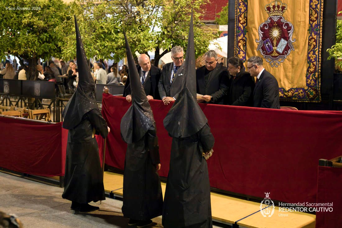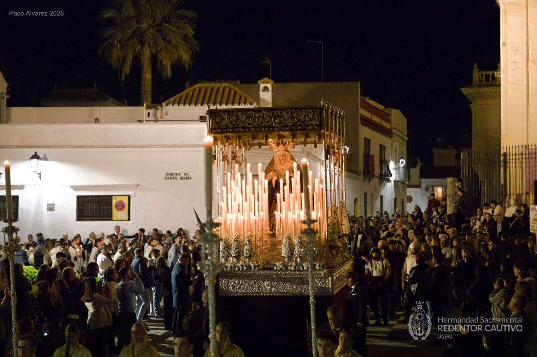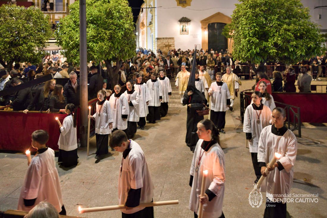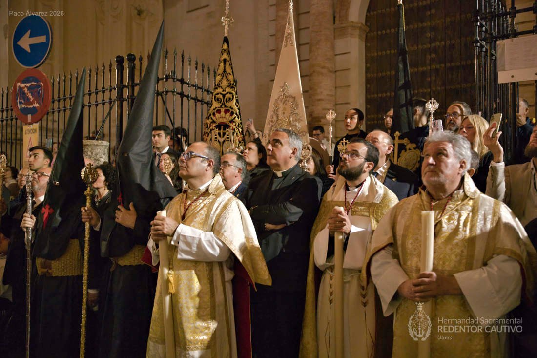 Jesús, Ntro. Padre Jesús Redentor Cautivo, avanza por las calles de Utrera. El mundo, indiferente, apenas detiene su mirada. Él camina en silencio por los senderos de la ingratitud y la injusticia; en sus manos no existe culpa alguna, salvo la del amor sin medida; sus pies desnudos pisan la gélida indiferencia del corazón humano, y su rostro, sereno en medio del dolor, refleja la obediencia perfecta y la redención del género humano.