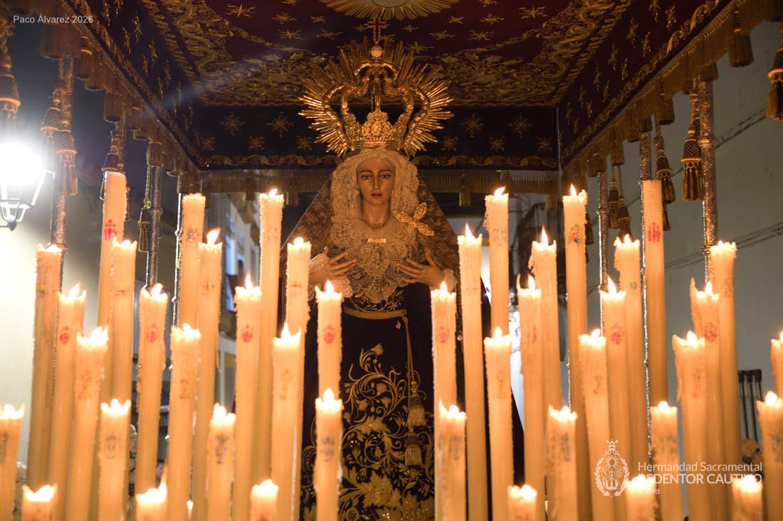 En el seno de nuestra Hermandad, este día adquiere una hondura espiritual aún más profunda. Aquí se encarna la vocación suprema del servicio, del silencio contemplativo y del sacrificio generoso. Cubiertos por el hábito penitencial, ocultos tras el antifaz y rodeados por el temblor de los cirios encendidos, los hermanos ofrecen al Señor sus promesas más íntimas, sus oraciones silenciosas y las lágrimas que brotan del alma, todo envuelto en humilde entrega.